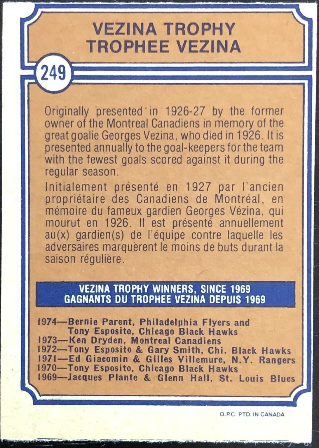 Card #249 NHL, hockey, vintage, OPC, hall of fame