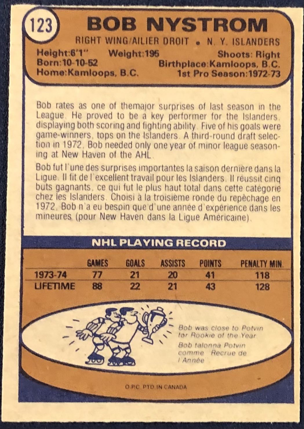 Card #123 NHL, hockey, OPC, vintage, rookie