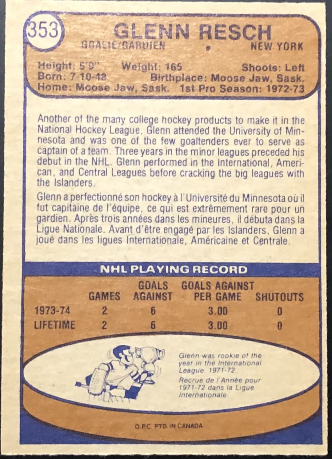 Card #353 OPC, vintage, NHL, hockey, rookie