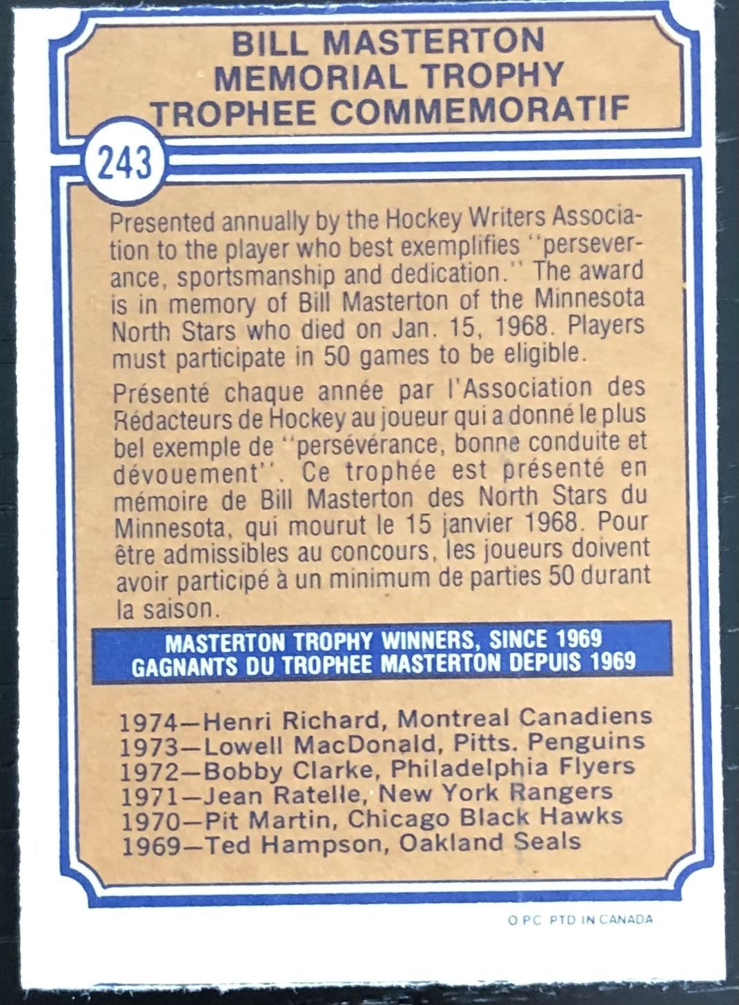 Card #243 NHL, hockey, vintage, OPC, hall of fame