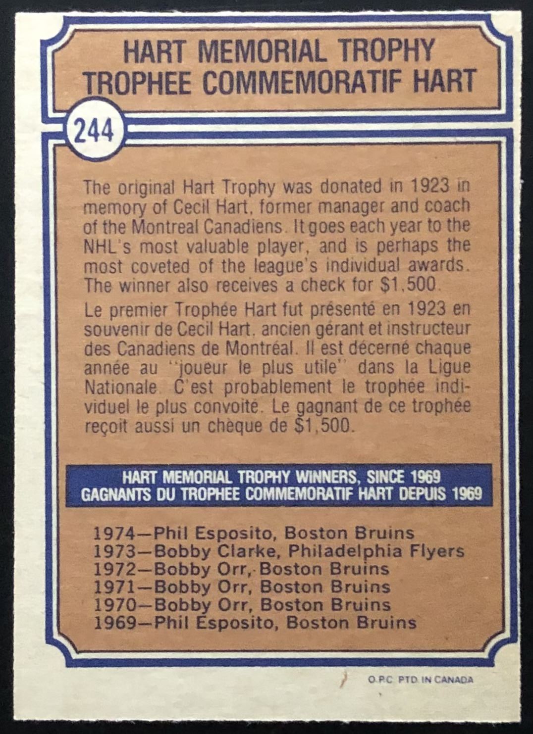 Card #244 NHL, hockey, vintage, OPC, hall of fame