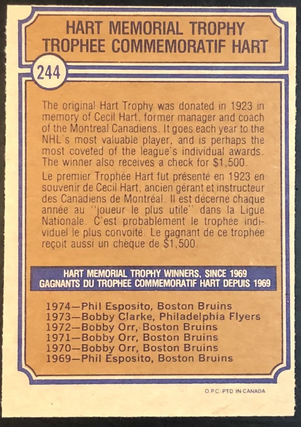 Card #244 NHL, hockey, vintage, OPC, hall of fame