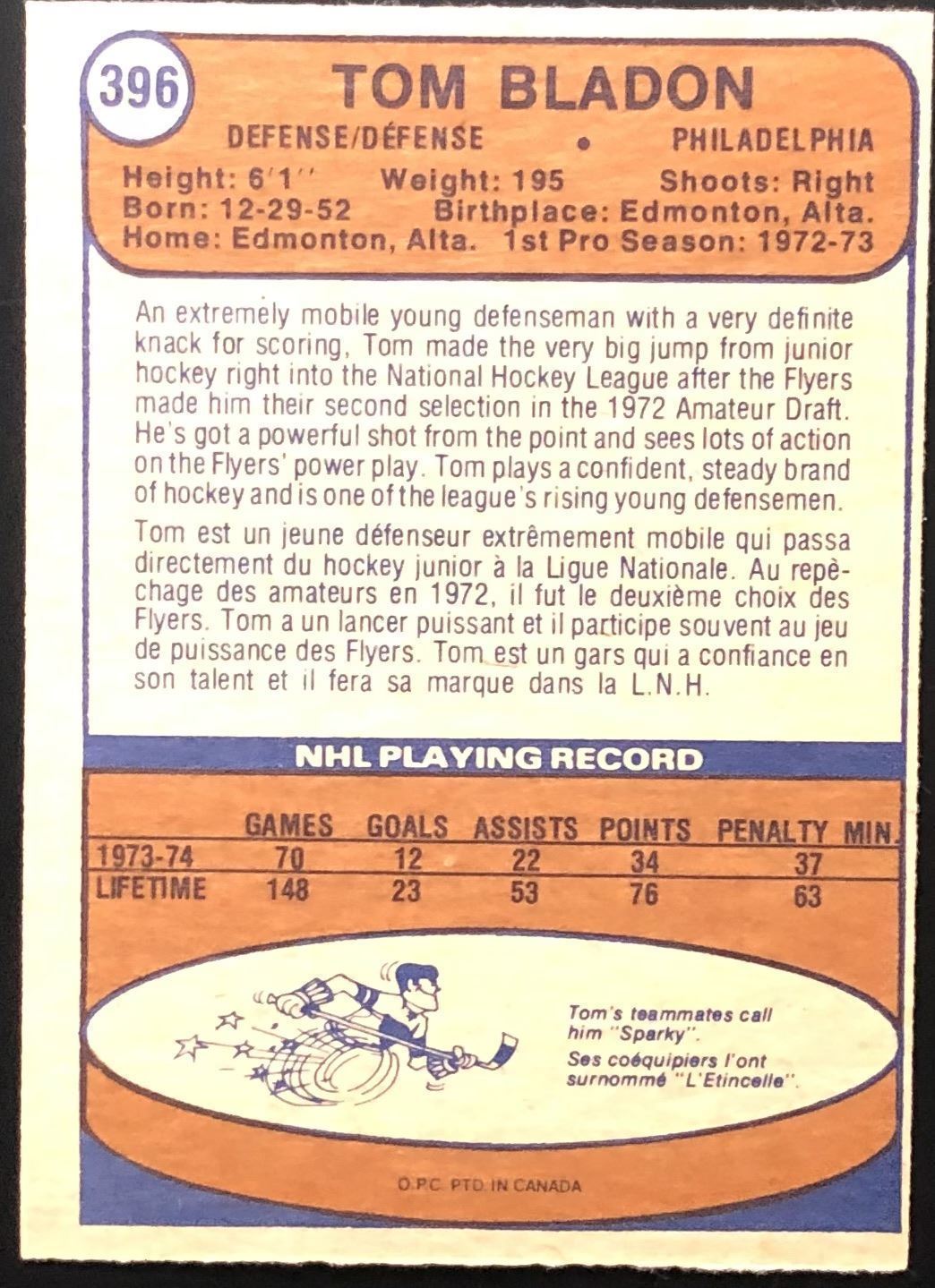 Card #396 NHL, hockey, vintage, OPC, rookie