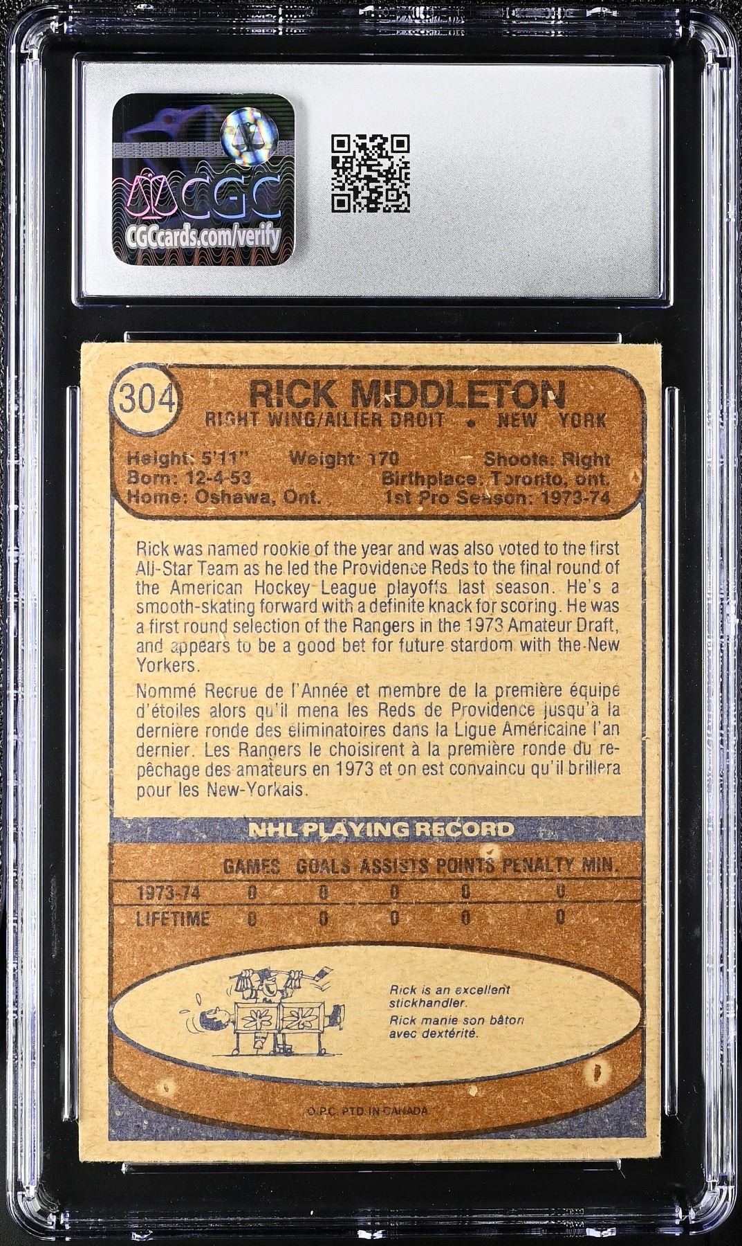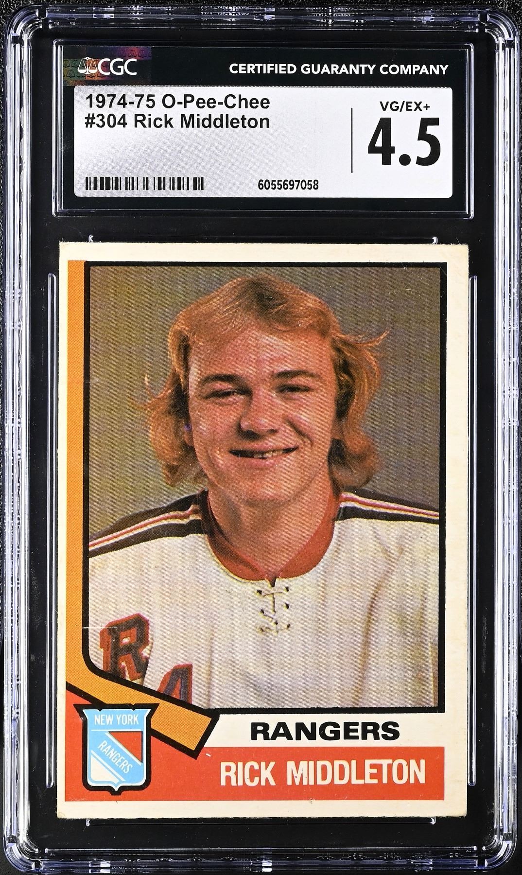 Middleton was a smooth and reliable scorer, potting 448 goals over his 14-year NHL career, including 11-straight 20+ goal seasons. He scored 30+ in seven straight seasons, including a five-season stretch of 40+ (high of 51), and registered two 100-point seasons (5x 90+ points). He was a Lady Byng winner, and a top-5 vote getter on six occasions which included a pair of runner-up finishes. This, his rookie card, is graded 4.5 VG-EX+ by CGC.
