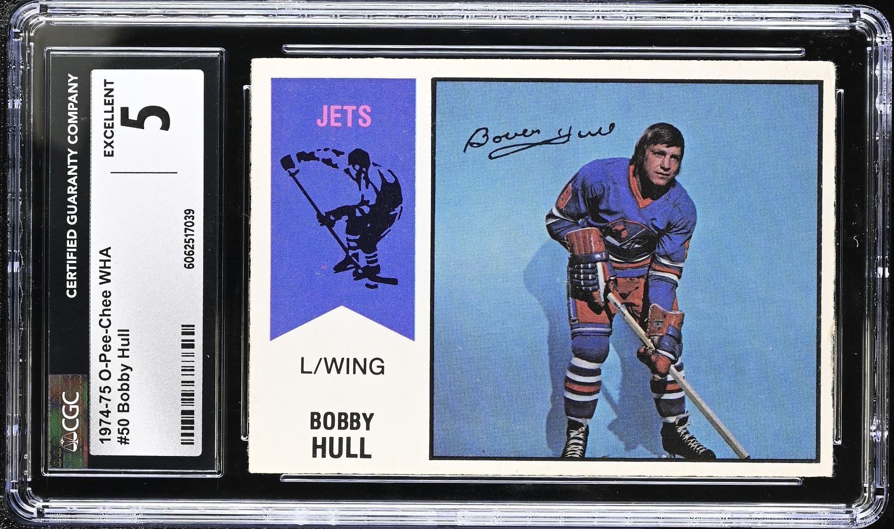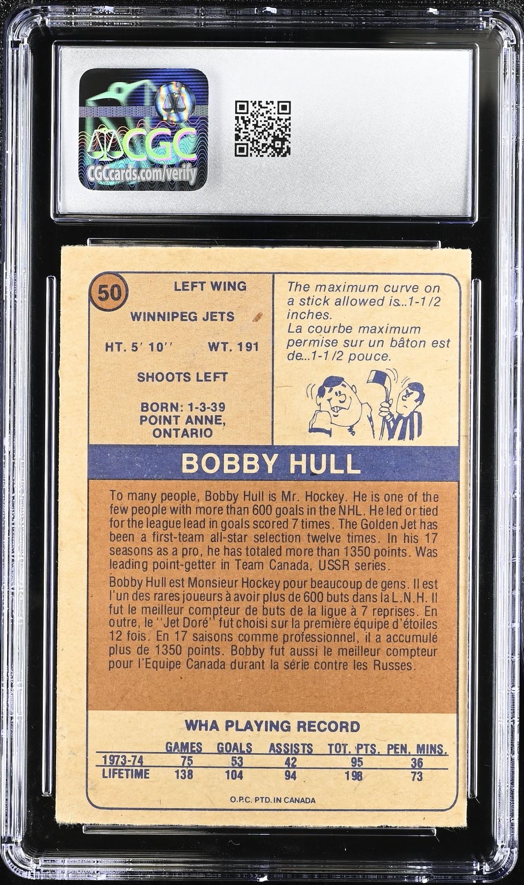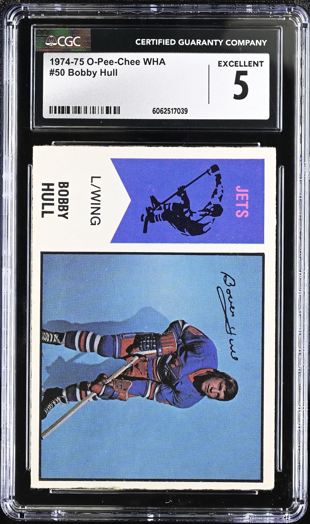HOFer Hull jumped to the WHA to become the highest paid player in the game. He was a 5-time 50-goal scorer in the NHL, and a 4-time 50+ goal scorer in the WHA where he would find success in Winnipeg with linemates Ulf Nilsson and Anders Hedberg. Graded 5 EXC by CGC.
