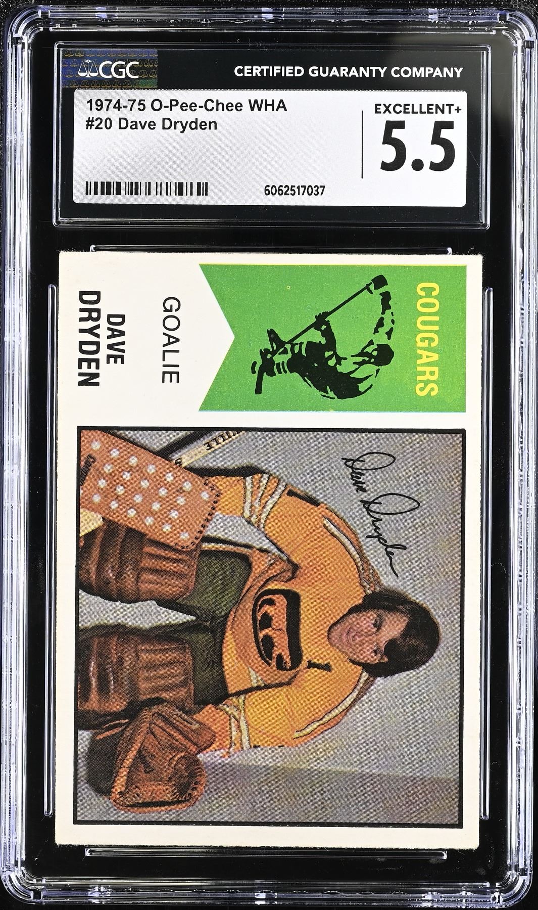 Older brother of HOF goaltender, Ken Dryden, Dave had a lengthy pro career in the net, from the 1974 OPC WHA set, graded 5.5 EX+ by CGC.