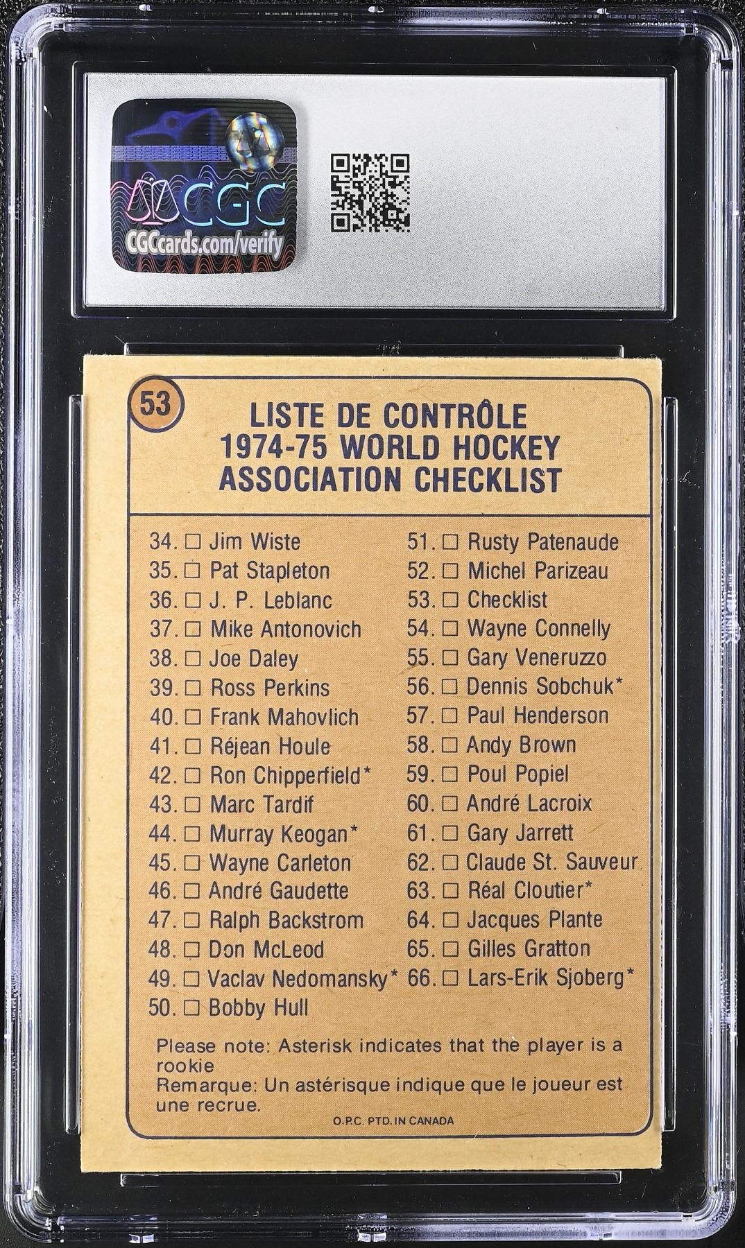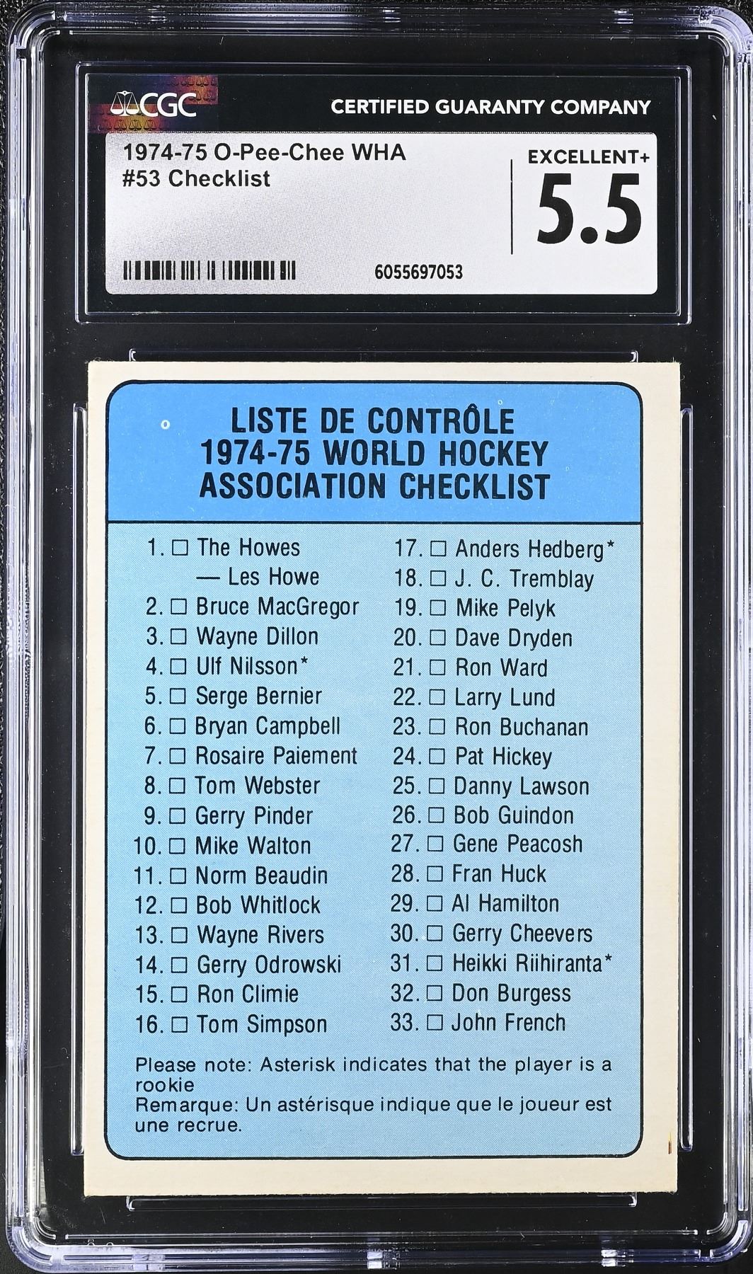Clean unmarked checklist from the 1974-75 OPC WHA set, graded 5.5 EX+ by CGC.