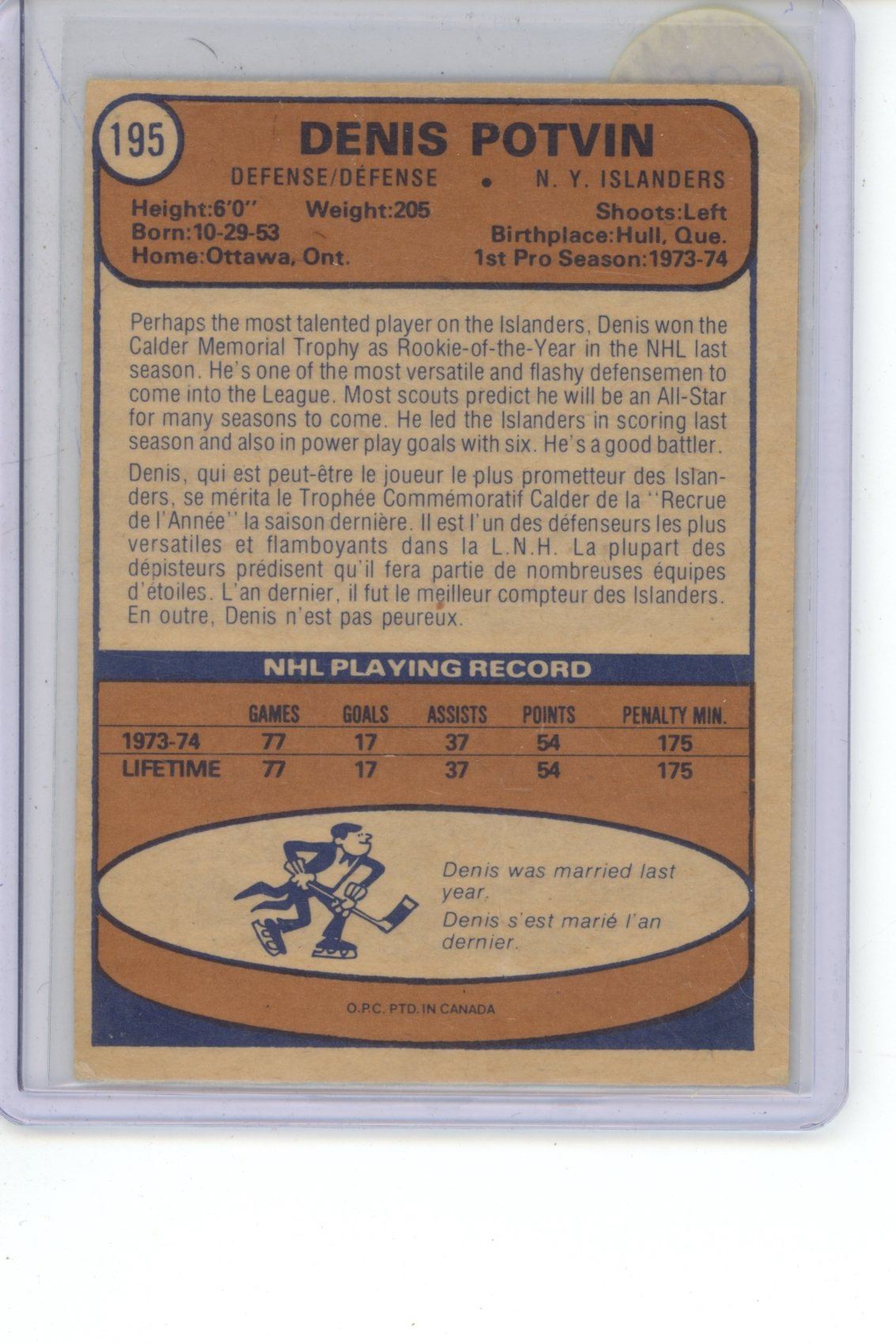 1974-75 Potvin OPC rookie Card #195