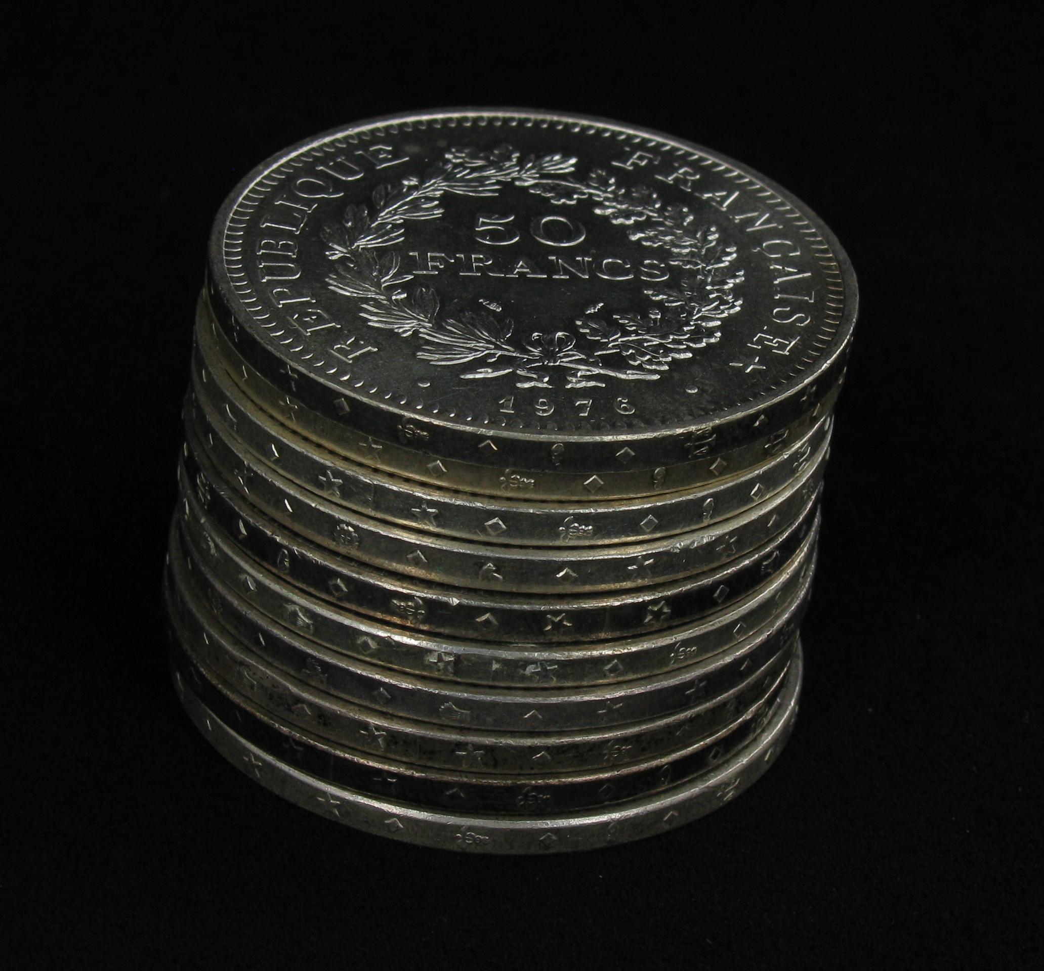 1974-79 France Silver 50 Francs Unsearched Stack of 10 Mostly BU 8.7 Ounces Silver! (COI-5236)