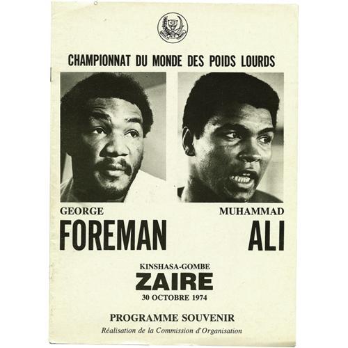 <B>1974 Ali vs. Foreman "Rumble in the Jungle" On-Site Fight Program.</B></I> When our consignor contacted the Heritage offices and informed us in a rather matter of fact fashion that, among his rather sizeable collection of Ali fight programs, he had an Ali-Foreman Rumble in the Jungle issue, we must admit a healthy skepticism. Surely it's for the closed caption broadcast, we thought. There's just no way it's the one from Zaire. Well, we're not too proud to admit when we're wrong, and in this case we're thrilled to have been mistaken. We couldn't believe our eyes when we opened up the package to find black and white photographic portraits of these two boxing legends staring back at us from the cover of the "Programme Souvenir" issued at "Kinshasa-Gombe, Zaire, 30 Octobre 1974."<BR><BR> Unquestionably the most coveted post-war boxing program in the hobby, the on-site Rumble in the Jungle program is also the hobby's scarcest. The story of the bout, taking on mythic proportions, is familiar to even the most casual fight fan. The great Muhammad Ali, unfairly stripped of his Heavyweight crown for failing to comply with Vietnam draft laws, looks to regain it from the frighteningly powerful Foreman, who many boxing experts believe will not only knock Ali out, but might kill him in the process. Ali was no longer the the elusive jungle cat he had once been, they believed, and no man could weather the storm of Foreman. But Ali is as smart as as ever, if not as fleet of foot, and employs a plan that will come to be known as "Rope-a-Dope." Rather than eluding the sledgehammer blows of Foreman, Ali leans back against the ropes and takes on the role of heavy bag, absorbing scores of punches on his arms and shoulders while protecting his head and midsection. The chants of "Ali, bomaye" ("Ali, kill him!") of the African crowd quiet as the fight drags on, as it appears that the ex-Champ will do nothing but receive a beating. But suddenly, in the eighth round, Ali sees his opportunity as pounces on the exhausted Foreman, landing a series of heavy blows that sends the Champ cartwheeling to the canvas. And once again, after seven long years, Ali is King.<BR><BR> One of only a theoretical handful from the event ever to leave the continent of Africa, this sixteen-page French language program remains in simply spectacular condition, with only the lightest touches of wear at the corners, a minor bend at top left corner and a tiny area of paper loss that should not knock it from NRMT status. But when considering the fact that programs from the most famous and beloved boxer in history's most noteworthy bout are all but non-existent in the hobby, even a battered and torn copy would be cause for celebration. This "finest known" example, however, is an absolute godsend, sure to answer the prayers of the most serious boxing collector. <BR><BR><B>Important notice:</B> Heritage usually auctions material at the rate of 200-250 lots per hour. On some occasions eBay Live bid software or the Internet may not be able to keep up with the pace of the auction. We recommend placing a realistic absentee bid now as insurance to avoid disappointment. Occasionally the auctioneer may eliminate or reject an eBay Live bid, and the auctioneer may also reopen a lot after the close of the eBay live bidding (usually because we missed an audience bid), and may reject your bid even if it shows you as the winning bidder. By bidding via eBay Live, you agree that Heritage may award the lot to another bidder at its sole discretion under the circumstances described above or any other reasonable circumstances. Since eBay bids are not shown to us until we open the lot on the floor, we treat those bids just like floor bids. In most cases the floor responds before the eBay bid is presented to us, due to Internet lag time, so for consistency we have made it a policy that floor bids are always considered first over tie eBay live bids. Also please note that all Heritage lots purchased through eBay Live carry a 22.5% Buyer's Premium. Please make sure you read the Terms and Conditions before you bid. This lot is being auctioned in conjunction with a live floor auction by Heritage Galleries & Auctioneers. All final auction and invoice information will be supplied by Heritage Galleries & Auctioneers, and all other information should be considered preliminary. Lot:19172 <BR><BR><B>Winning Notification and Billing:</B> After the FINAL session in this auction is complete, Heritage will send e-mail and snail mail invoices. This process normally takes several days. All final auction and invoice information will be supplied by Heritage Galleries & Auctioneers, and all other information should be considered preliminary. <BR><BR>This auction will be conducted on a live auction floor and over the Internet through eBay Live. If you choose to place an absentee bid, please take a moment to <font color='#0000ff'><u><a href='http://pages.ebay.com/liveauctions/help/before/laabsentee.html'>learn how eBay Live absentee bidding works</a></u></font><font color='#000000'>