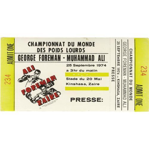 <B>1974 Ali vs. Foreman "Rumble in the Jungle" Full Ticket.</B></I> On October 30, 1974 World Heavyweight Champion George Foreman defended his title against the former Champion Muhammad Ali in Kinshasa, Zaire. Foreman entered the ring seeming almost invincible. He was forty and zero with thirty-seven victories by knockout. He was in the prime of his life at twenty-six years old, six years younger than the challenger. If that was not enough, Foreman had destroyed two men in two rounds each, Joe Frazier and Ken Norton, both of whom had given Ali fits. Ali was a heavy underdog, but was coming off a win over Joe Frazier that had propelled him into a position to challenge Foreman. Early in the fight it looked bad for Ali. The bigger and stronger Foremen continually pelted Ali with huge punches while Ali covered up on the ropes offering little opposition. The fight went that way for almost five rounds. But Foreman began to tire from throwing a continual bombardment of punches and after the fifth Ali took over. His "rope-a-dope" strategy worked like a charm. Foreman tired badly and Ali had plenty left. By the eighth round Foreman had a hard time lifting his arms. A big right hand from Ali put Foreman down for good and Ali had miraculously won his second World Heavyweight Championship, becoming only the second man in boxing history to perform the feat. Presented here is a full, unused ticket to the event. The ticket does have a seat number and is an assigned press section ticket. President Mobutu of Zaire is pictured on the reverse. The ticket has the stub firmly attached and exhibits only slight fading from age. A scarce full ticket from one of Muhammad Ali's most famous fights. <I>LOA from Craig Hamilton / JO Sports.</B></I>