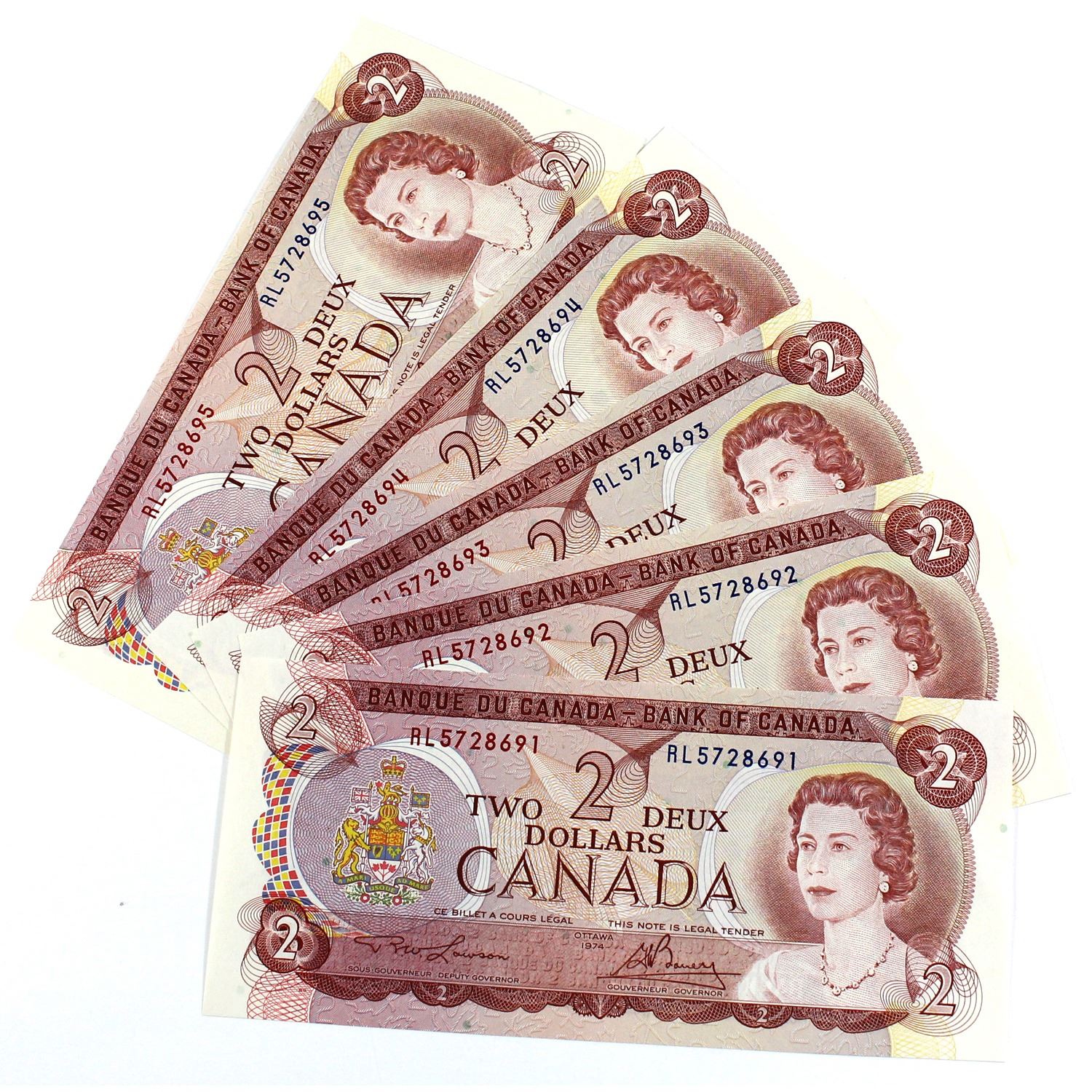 1974 BC-47a Bank of Canada $2 Notes Lawson-Bouey Signatures with Consecutive Serial Numbers RL5728691-695, UNC. 5pcs