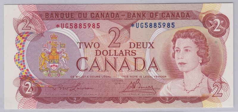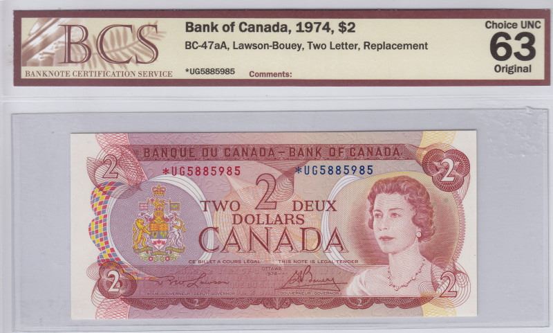 1974 Bank Of Canada $2 Two Letter Replacement Bank Note - Lawson/Bouey - BCS Certified Choice UNC 63 - BC-47aA - Trends Value $225
