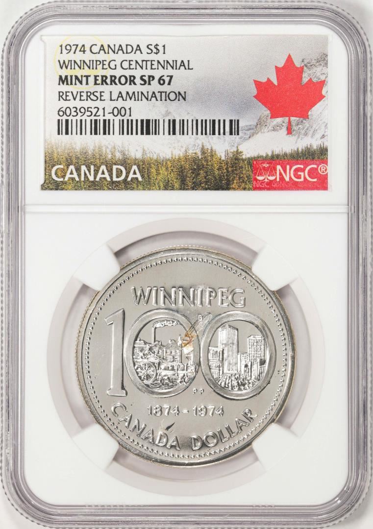 One 1974 Canada $1 Winnipeg Centennial Silver Dollar Coin Error Reverse Lamination NGC SP67. NGC Certified.