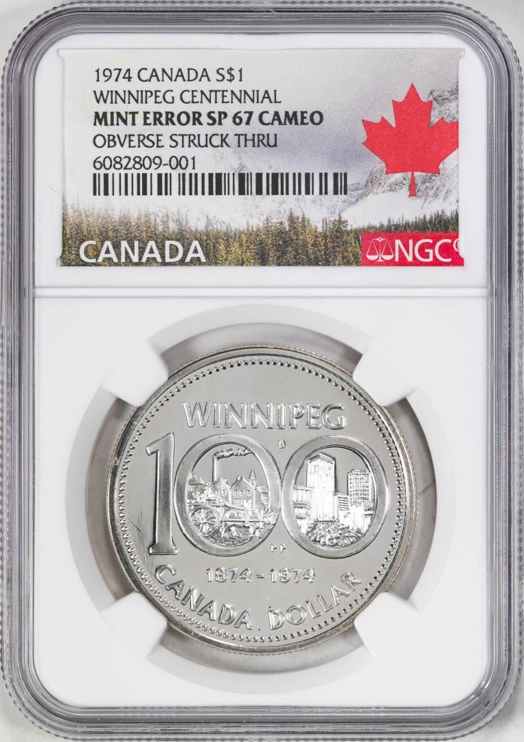 One 1974 Canada $1 Winnipeg Centennial Silver Dollar Coin NGC Mint Error SP67 Cameo Obverse. NGC Certified.
