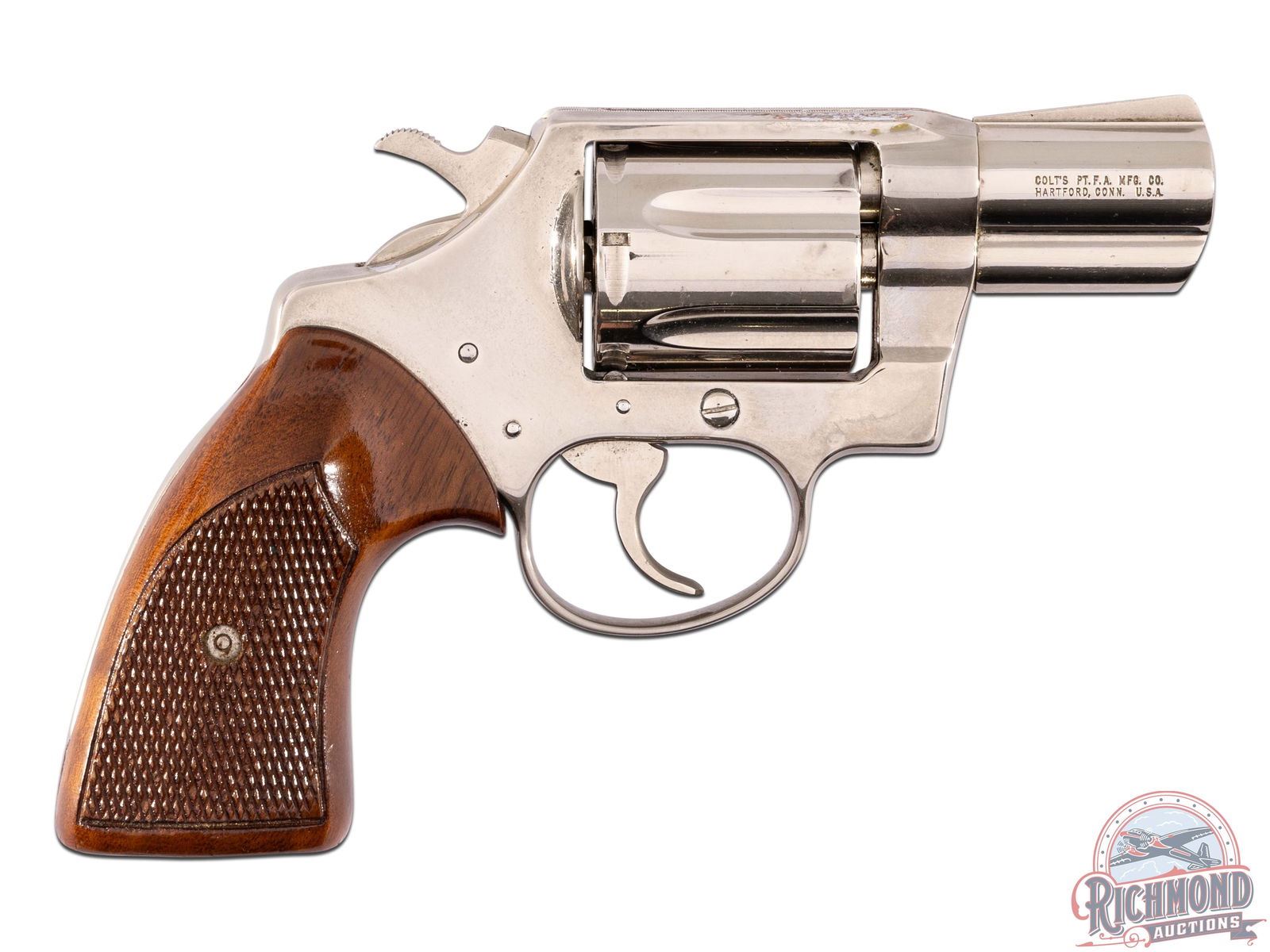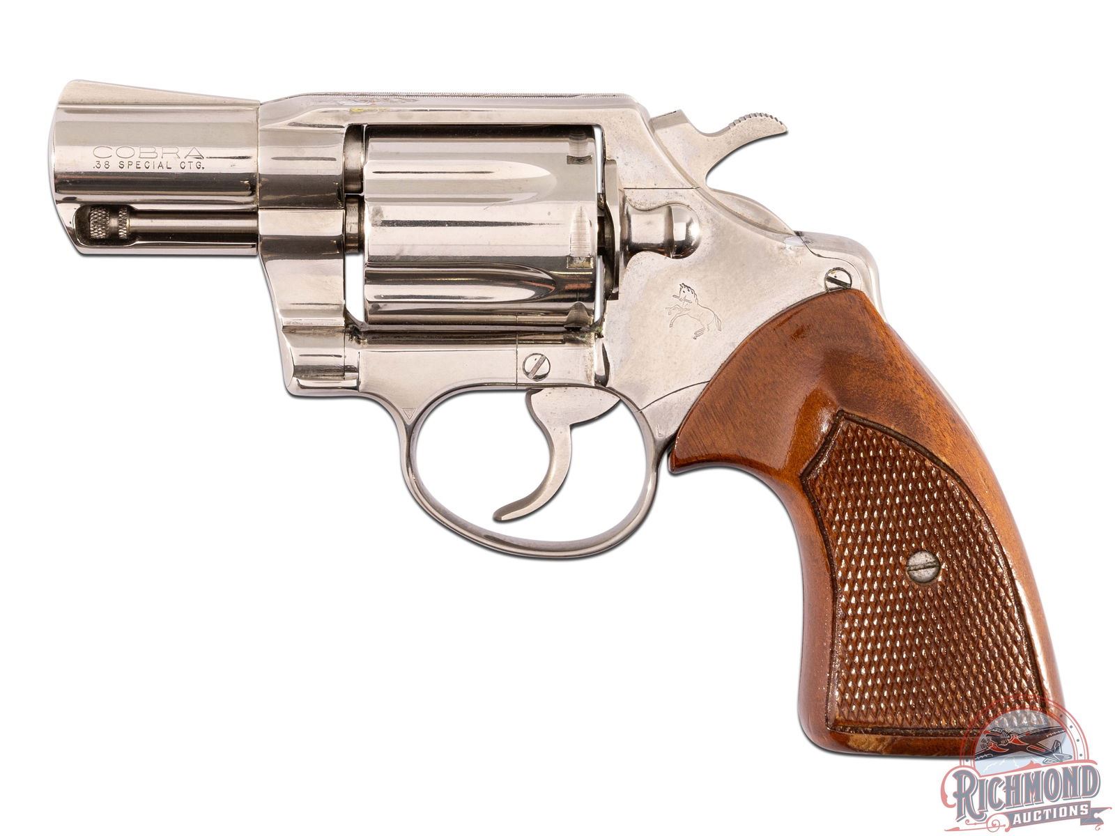Manufactured in 1974. This conceal carry features a snub nose 2" barrel with ejector shroud, rear integrated notch sight and ramp front sight. Left side of the barrel is stamped "COBRA / 38 SPECIAL CTG." and right side stamped with a two-line Colt address. Nickel plated finish with a 6-round fluted swing-out cylinder chambered for the 38 Special cartridge. Fitted with Colt factory walnut checkered grips. CALIBER: 38 SPL. S/N: F70493. FFL STATUS: Curio & Relic.