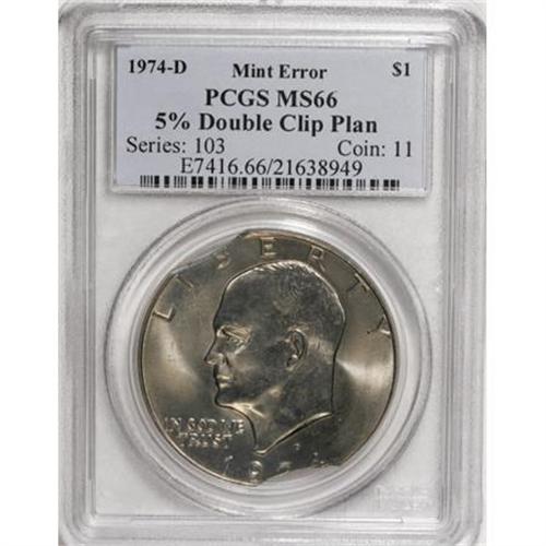<B>1974-D $1 Eisenhower Dollar--5% Double Clip Planchet--MS66 PCGS.</B></I><BR><BR><B>Coin Engraver:</B> Frank Gasparro<BR><BR><b>Shipping:</b> Coins & Currency (<a target="_blank" href="http://www.heritageauctions.com/common/shipping.php">view shipping information</a>)