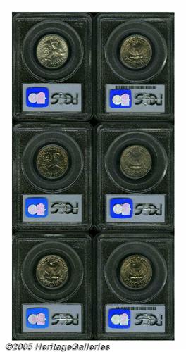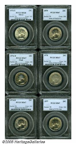 <B>1974-D<25C> MS67 PCGS,</B></I> immaculate, tan color, a good strike; <B>1976-D Clad MS67 PCGS,</B></I> rich lemon patina, very clean; <B>1976-S Silver MS68 PCGS,</B></I> the fields are pristine, a hint of gold color; <B>1977 MS67 PCGS,</B></I> luxurious honey color, carefully preserved; <B>1978 MS67 PCGS,</B></I> dusky apricot and steel-blue toning; and a <B>1979 MS67 PCGS,</B></I> undisturbed, lustrous, chestnut hues.<BR><I>From The Gary Kramer Collection of Washington Quarters.</B></I>