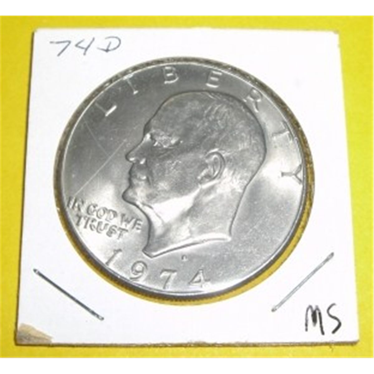 1974-D Eisenhower Dollar *MS GRADE* coin has an x marked on it but nice luster!! ***Coin & Currency Grades, Conditions & Values are not Safe Deposit Coins Responsibilty. Grades, Conditions & Values are determined by Consigner(s) & Buyers***