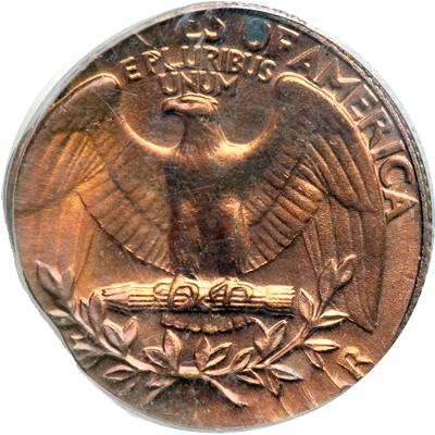 1974-D Washington Quarter Dollar. PCGS graded MS-64. Mint error. Struck on a 1¢ planchet. Shimmering red hues. Clear date and mintmark present (PCGS # 5894).