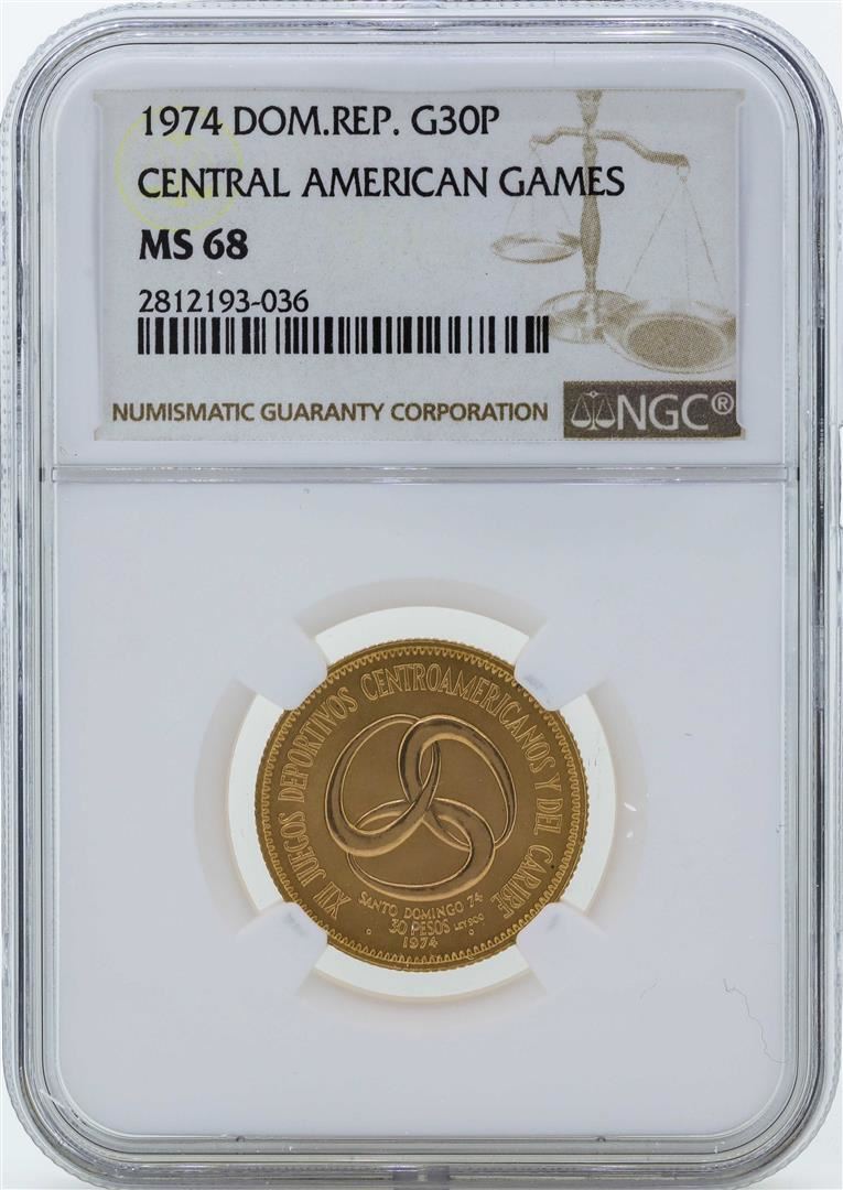 One 1974 Dominican Republic 30 Pesos Central American Games Gold Coin NGC MS68. NGC Certified.