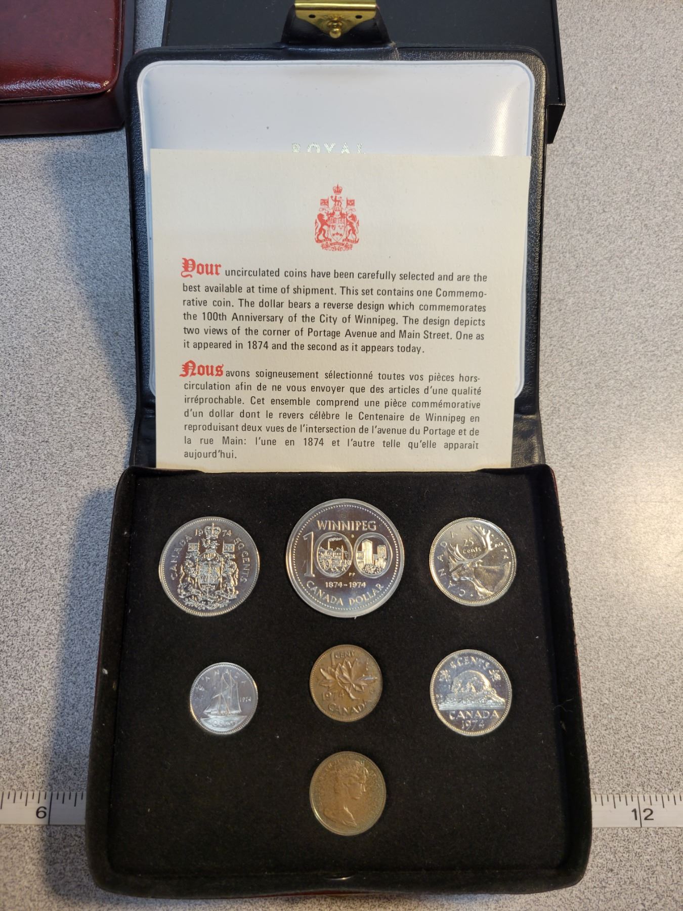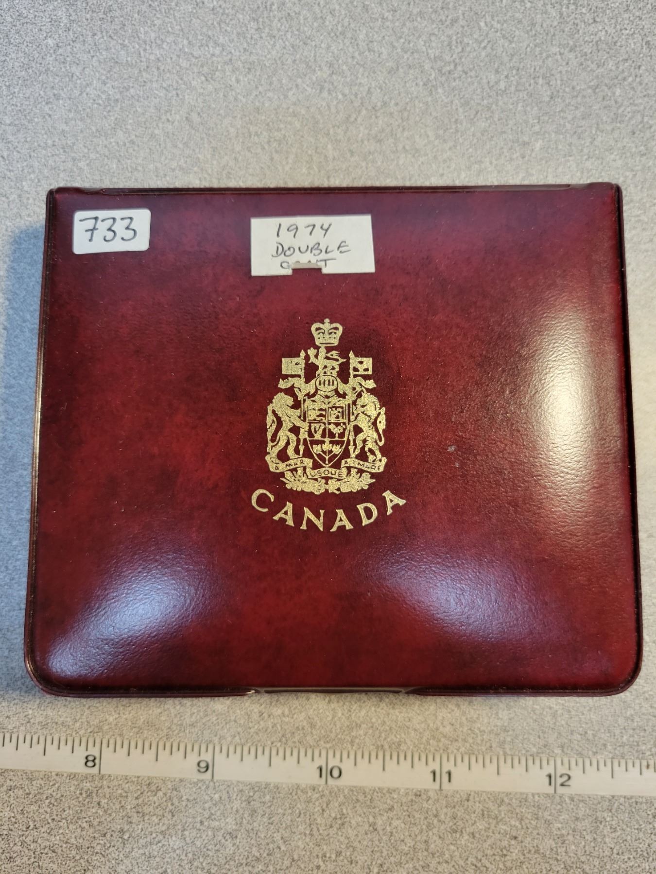 1974 Double Cent Custom Set. 7-coin set with 2 Cents. BU. Housed in its maroon case with Canada stamped in Gold.