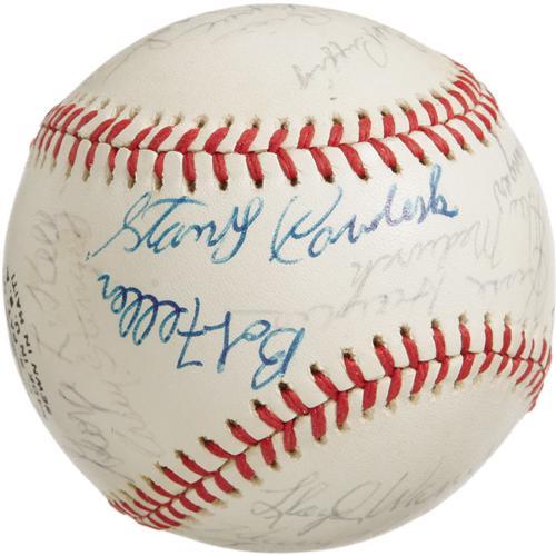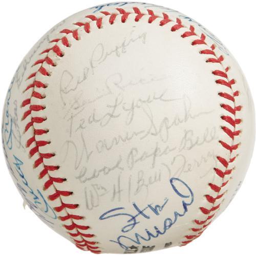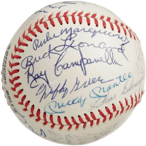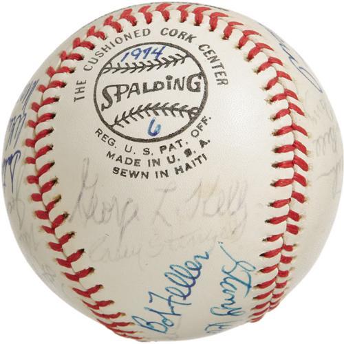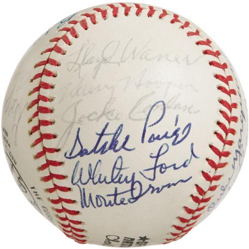 <B>1974 Hall of Famers Multi-Signed Baseball.</B></I> Memorable assortment of top tier talent appears on an ONL (Feeney) ball that made the rounds at the 1974 Cooperstown induction ceremonies. The cast is as follows: Lloyd Waner, Hooper, Conlan, Paige, Ford, Irvin, Ruffing, Rice, Lyons, Spahn, Bell, Terry, Musial, Kelly, Stengel, Coveleski, Feller, Haines, Medwick, Gehringer, Mantle, Grove, Leonard, Marquard and Campanella (secretarial). Half of the autographs remain in flawless 10/10 condition, while the balance have mellowed a couple notches to 7/10 to 8/10 in boldness. A quick and appealing way to bring a slew of important autographs into your collection. <I>LOA from PSA/DNA. LOA from James Spence Authentication.</B></I><BR><BR><b>Shipping:</b> Balls, Pucks, etc., Small (<a target="_blank" href="http://www.heritageauctions.com/common/shipping.php">view shipping information</a>)