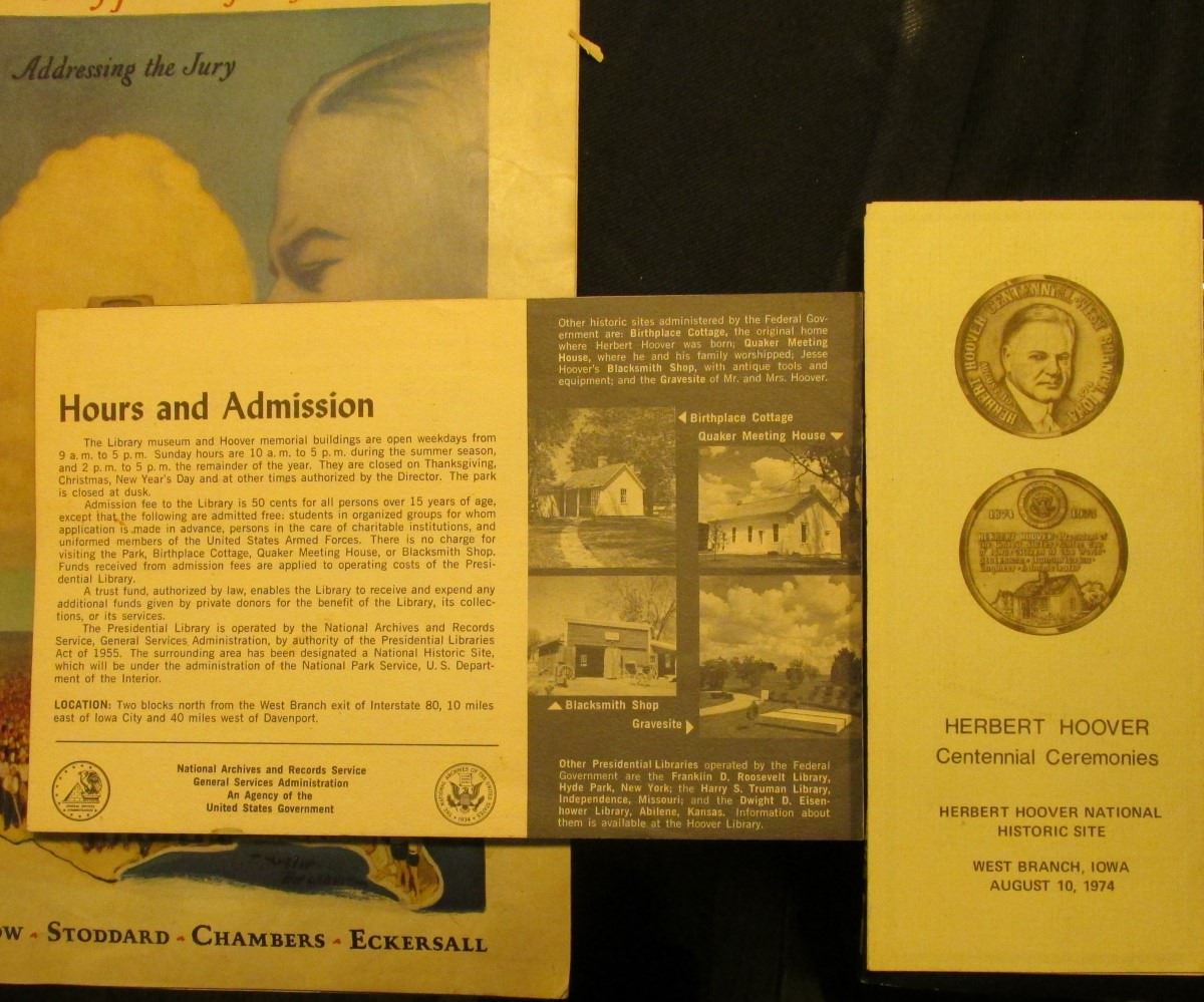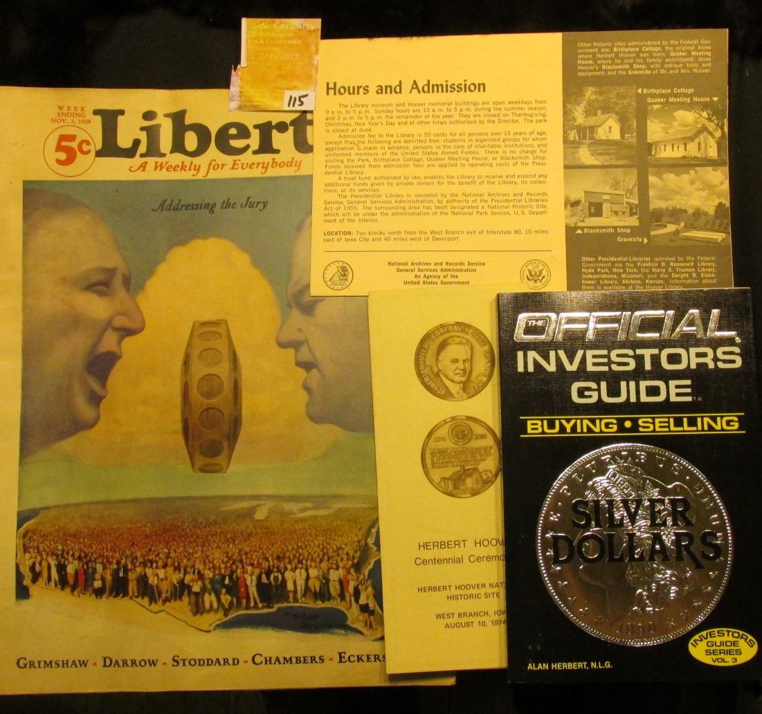 1974 "Herbert Hoover Centennial Ceremonies Herbert Hoover National Historic Site" Brochure; booklet "Herbert Hoover Presidential Library and Museum West Branch, Iowa 52358" Brochure; "Nov. 3, 1928 5c Liberty A Weekly for Everybody" with title story "Addressing the Jury" cover depicts Herbert Hoover; & First Edition The Official Investors Guide Buying Selling Silver Dollars, by Alan Herbert, N.L.G. Mint Condition.