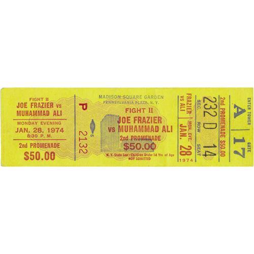 <B>1974 Frazier vs. Ali II Full Ticket.</B></I> On January 28, 1974, at New York's Madison Square Garden Muhammad Ali and Joe Frazier fought for the second time in their careers. The two had fought at the same venue in 1971 with the heavyweight title at stake. In that spectacular fight Joe Frazier knocked Ali down in the final round and won a unanimous decision. It was Ali's first defeat as a professional. Since that first fight Frazier had lost his title to powerful George Foreman. This rematch with Ali was to determine who would be Foreman's next opponent. At stake was Ali's NABF Title, so the fight was set for twelve rounds. The fight lacked the drama of the first meeting, but not the action. When it was over, Ali emerged with a hard fought unanimous twelve round decision, although a number of observers at ringside thought Frazier had won. Offered here is a full ticket from this fight. The ticket is in fine condition and displays well. <BR><BR><B>Important notice:</B> Heritage usually auctions material at the rate of 200-250 lots per hour. On some occasions eBay Live bid software or the Internet may not be able to keep up with the pace of the auction. We recommend placing a realistic absentee bid now as insurance to avoid disappointment. Occasionally the auctioneer may eliminate or reject an eBay Live bid, and the auctioneer may also reopen a lot after the close of the eBay live bidding (usually because we missed an audience bid), and may reject your bid even if it shows you as the winning bidder. By bidding via eBay Live, you agree that Heritage may award the lot to another bidder at its sole discretion under the circumstances described above or any other reasonable circumstances. Since eBay bids are not shown to us until we open the lot on the floor, we treat those bids just like floor bids. In most cases the floor responds before the eBay bid is presented to us, due to Internet lag time, so for consistency we have made it a policy that floor bids are always considered first over tie eBay live bids. Also please note that all Heritage lots purchased through eBay Live carry a 22.5% Buyer's Premium. Please make sure you read the Terms and Conditions before you bid. This lot is being auctioned in conjunction with a live floor auction by Heritage Galleries & Auctioneers. All final auction and invoice information will be supplied by Heritage Galleries & Auctioneers, and all other information should be considered preliminary. Lot:19171 <BR><BR><B>Winning Notification and Billing:</B> After the FINAL session in this auction is complete, Heritage will send e-mail and snail mail invoices. This process normally takes several days. All final auction and invoice information will be supplied by Heritage Galleries & Auctioneers, and all other information should be considered preliminary. <BR><BR>This auction will be conducted on a live auction floor and over the Internet through eBay Live. If you choose to place an absentee bid, please take a moment to <font color='#0000ff'><u><a href='http://pages.ebay.com/liveauctions/help/before/laabsentee.html'>learn how eBay Live absentee bidding works</a></u></font><font color='#000000'>