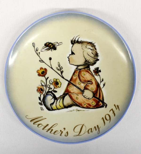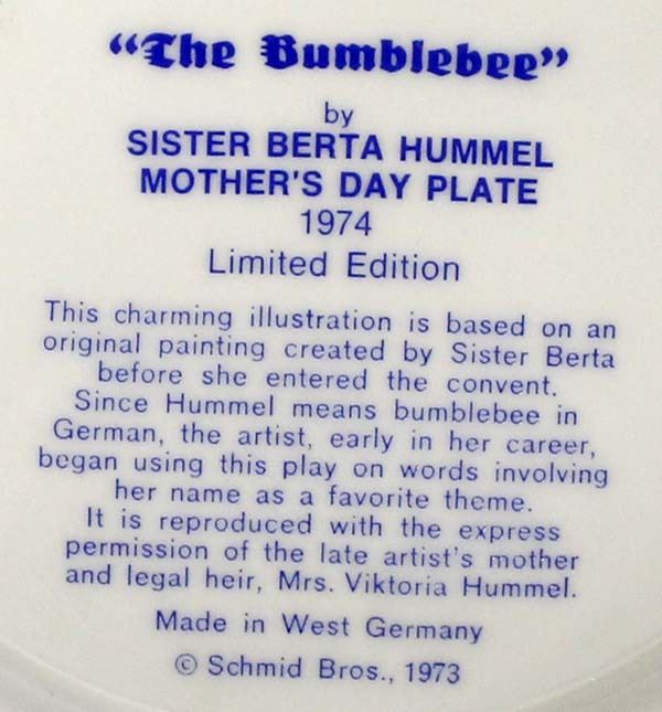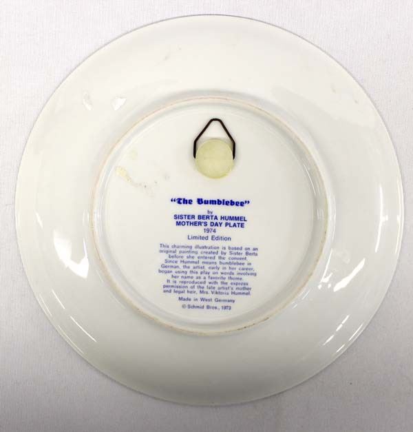 1974 Limited Edition Hummel Mother's Day Plate, ''The Bumblebee'' by Sister Berta Hummel, measures 7.75''D, made in West German and distributed by Schmid Brosl, 1973