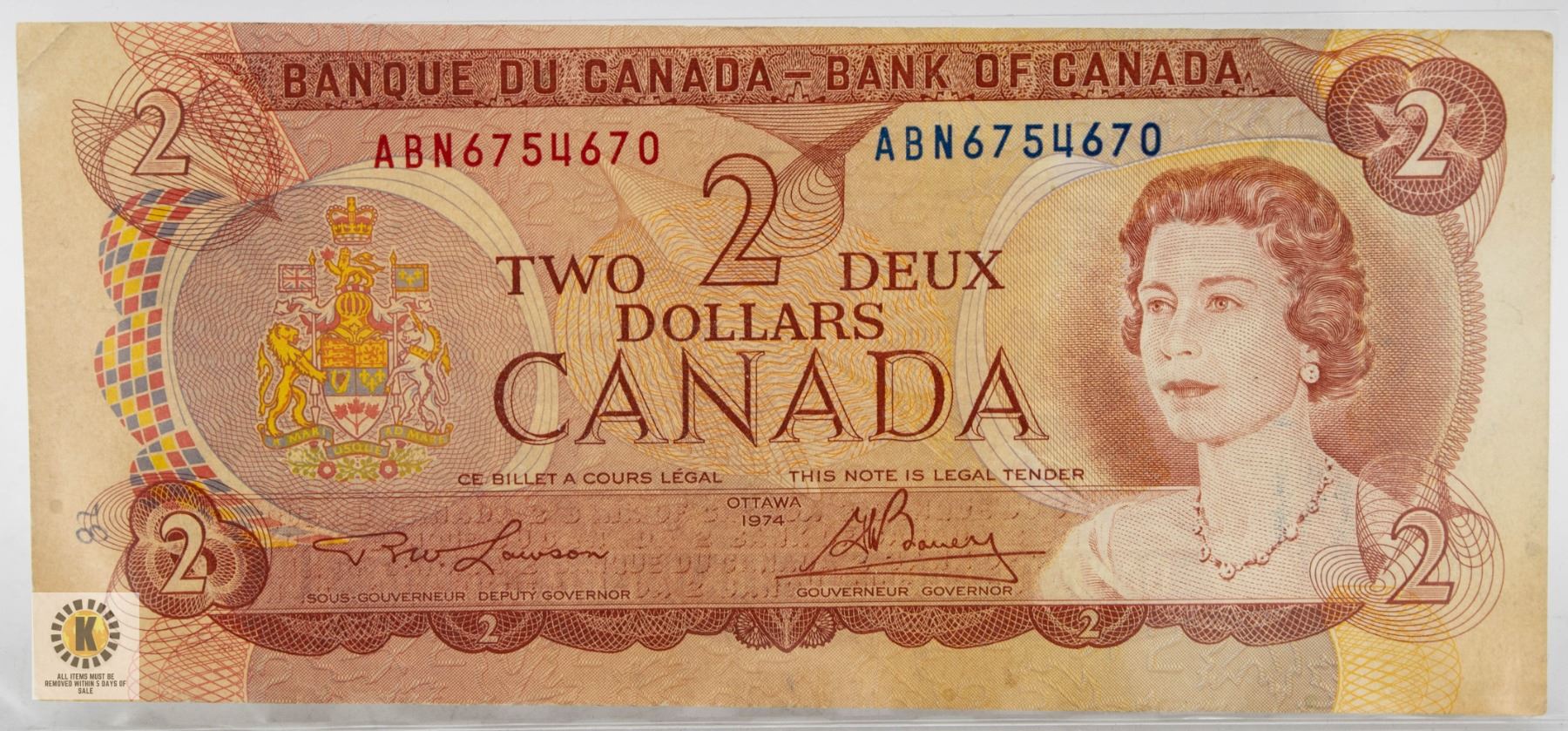 CANADIAN $2 DOLLAR BILL (CURRENT BOOK VALUE $65) **ALL ITEMS MUST BE REMOVED BY 5PM SATURDAY, APRIL 5TH 2025. ALL REMAINING ITEMS WILL BE SUBJECT TO A $6.00 PER DAY STORAGE CHARGE. ANY ITEMS REMAINING AFTER MONDAY, APRIL 21ST 2025 WILL BE CONSIDERED FORFEITED. NO REFUNDS WILL BE ISSUED FOR FORFEITED ITEMS. TO SCHEDULE A PICK UP APPOINTMENT CLICK HERE