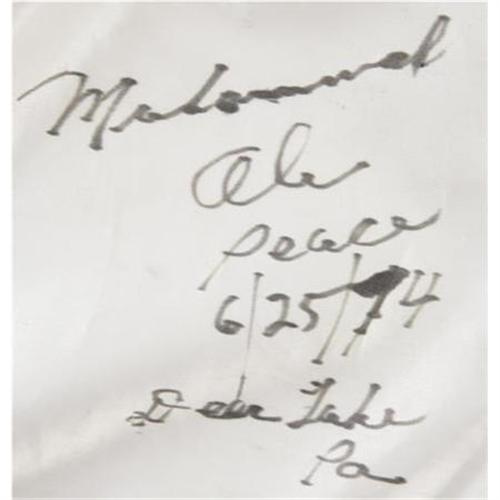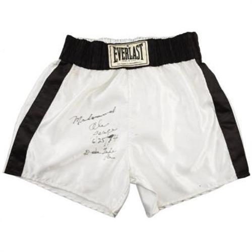 <B>1974 Muhammad Ali Trunks Worn in Training for Foreman Bout.</B></I> White satin trunks in Ali's unmistakable black trim on white style date from the weeks leading up to his greatest triumph, his upset victory over George Foreman in the Kinshasa, Zaire battle known forever after as "The Rumble in the Jungle." The center front waistband holds a white "Everlast" manufacturer's label with the slogan "Made Expressly for Muhammad Ali" in block lettering at the lower edge. On the right leg is found a vintage black marker inscription which reads, "Muhammad Ali, Peace, 6/25/74, Deer Lake, Pa," the location denoting that of Ali's rural training camp. When one considers the fact that Ali was working to reacquire the Heavyweight Championship belt which had been unfairly stripped from him seven years earlier for his refusal to participate in the Vietnam draft, the significance of the offered lot becomes quite clear. A letter from noted boxing expert Craig Hamilton expresses that the trunks had been given as a gift to a female friend of Ali at the time, and were originally acquired from her directly. The trunks exhibit fine wear and very minor staining, but still present marvelously, with the inscription maintaining the same boldness it enjoyed upon its application. A special piece from one of the most important periods in postwar pugilistic history. <I>LOA from Craig Hamilton. LOA from James Spence Authentication (autograph).</B></I><BR><BR><b>Shipping:</b> Clothing, Costumes & Jerseys (<a target="_blank" href="http://www.heritageauctions.com/common/shipping.php">view shipping information</a>)