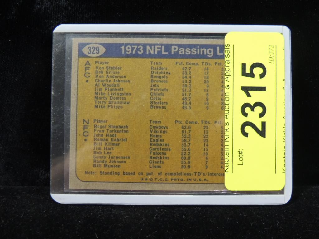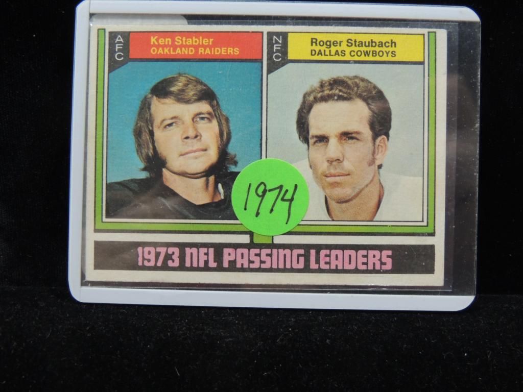 1973 NFL PASSING LEADERS FOOTBALL PLAYER CARD. KEN STABLER & ROGER STAUBACH. AS SHOWN. SEE PHOTO FOR MORE DETAILS.