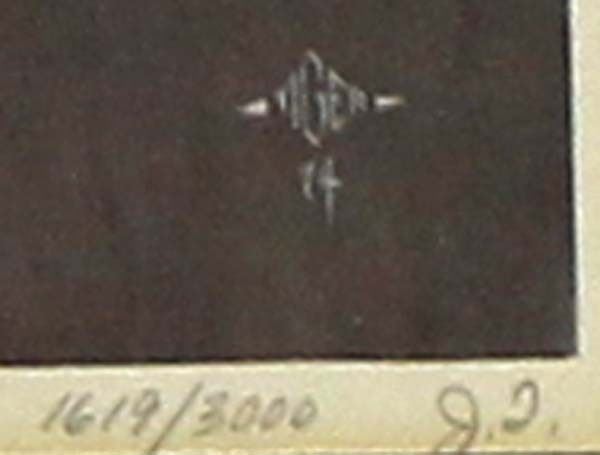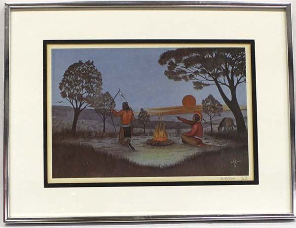 Native American Muscogee Creek-Seminole Jerome Tiger Print, (1941-1967) , #1619/3000, framed, double matted, and under glass, hand numbered and initialed, visual measures 7.25'' x 11''