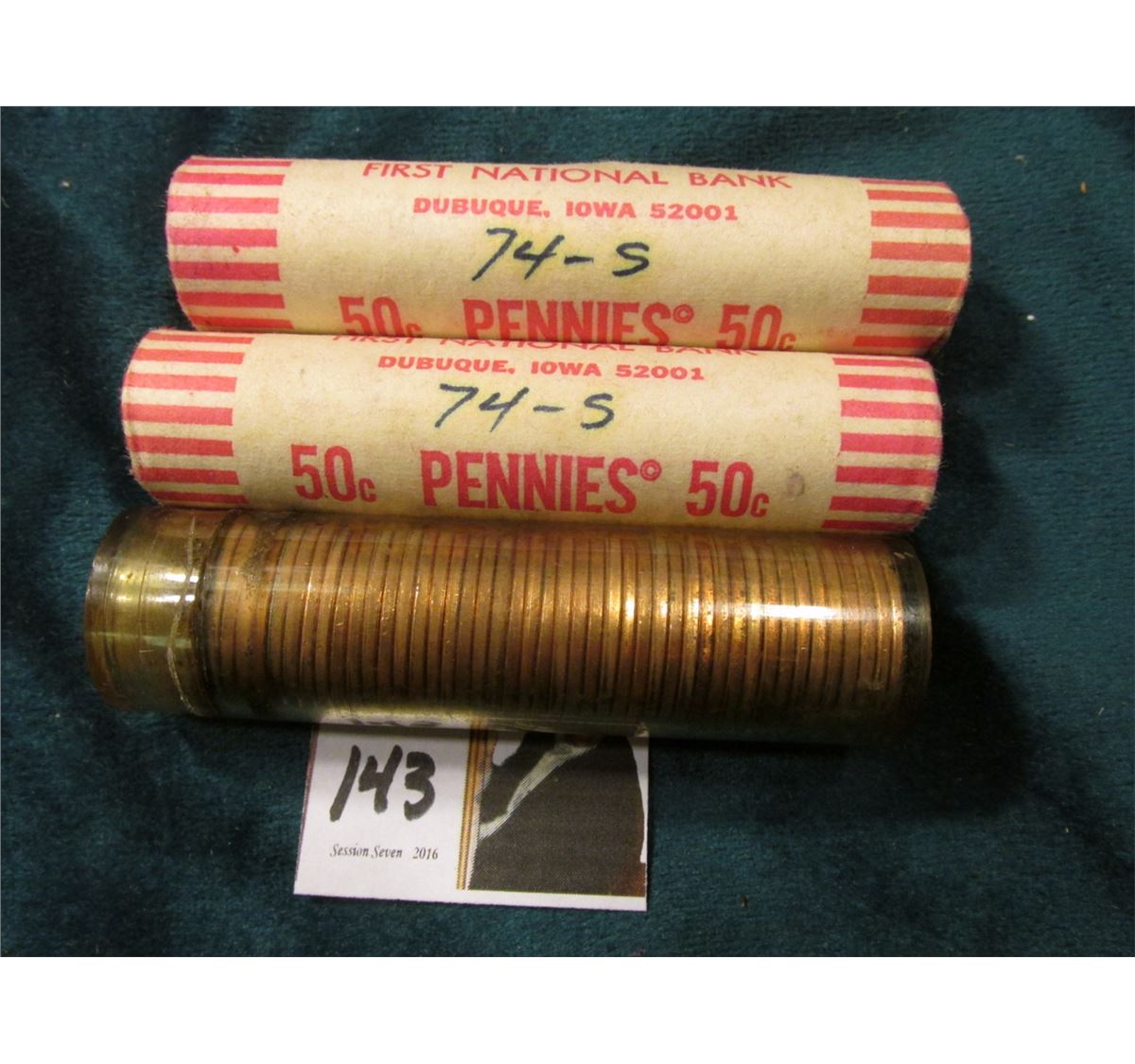 1974 P (in bad shape with plastic shrinkage) & (2) 74 S Original Uncirculated Rolls of U.S. Lincoln Cents. Maybe an occasional carbon speck in this roll. (3) Rolls.