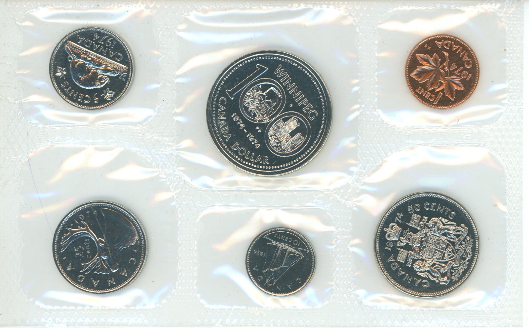 1974 Proof Like Set. 6-coin set. Nickel Dollar commemorates the Centennial of Winnipeg.
