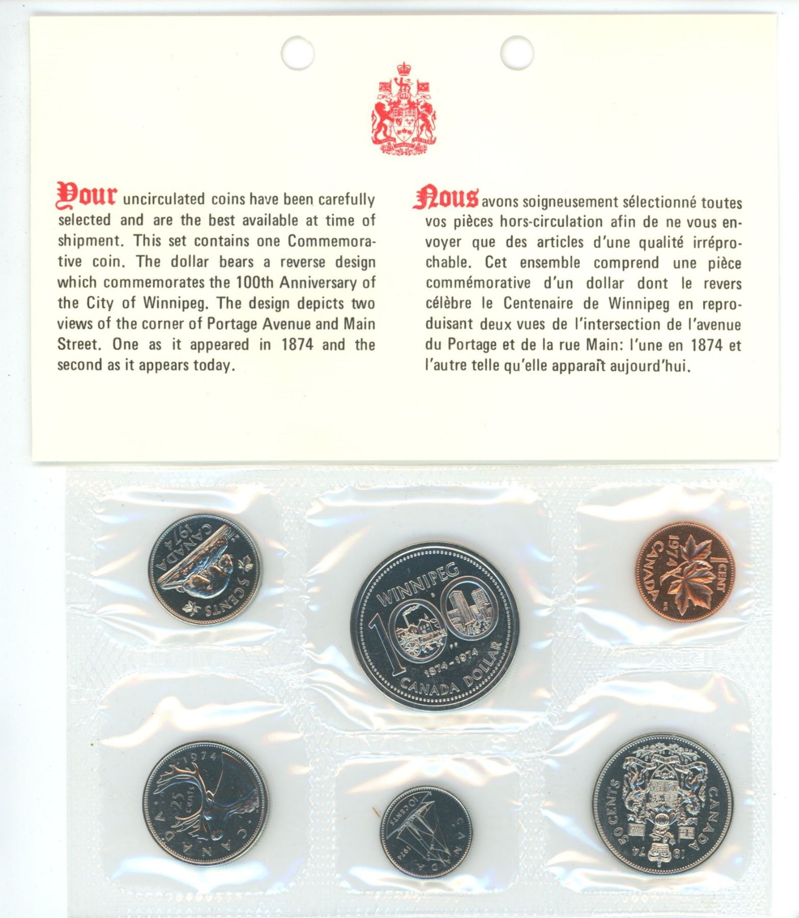 1974 Proof Like Set. 6-coin set includes Nickel Dollar that commemorates the centenary of Winnipeg.