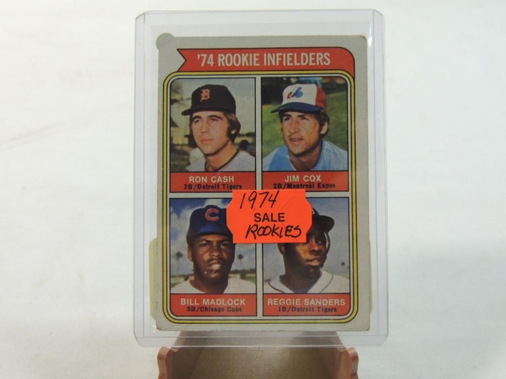 1974 ROOKIE INFIELDERS TOPPS RON CASH DETROIT TIGERS, JIM COX MONTREAL EXPOS, BILL MADLOCK CHICAGO CUBS, REGGIE SANDERS DETROIT TIGERS. BASEBALL PLAYER CARDS. TRADING CARDS. COLLECTIBLE. BASEBALL MEMORABILIA. GOOD CONDITION AS SHOWN. SEE PHOTO FOR MORE DE