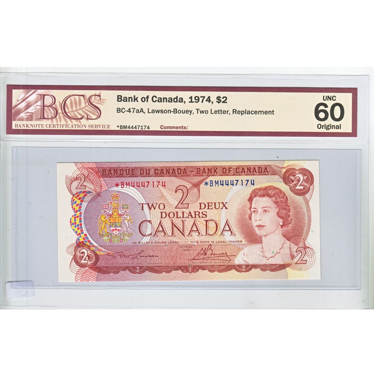 1974 Replacement $2.00 Note from the Bank of Canada; cat code BC-47aA, Lawson-Bouey signatures, Prefix *BM, BCS Certified UNC-60, Original. Buyers Premium will be added on all items as per our terms of sale. We accept Paypal, Credit Card, E-Transfer Payments, Cheque or Money Orders (there is an additional 3% fee for using Paypal or Credit Card). All invoices will be emailed immediately following the auction, please contact us if you would like to pay by credit card or receive a new revised lower total for mailing in payment or sending an e-transfer (3% discount). All Items Are Sold "AS IS", no returns