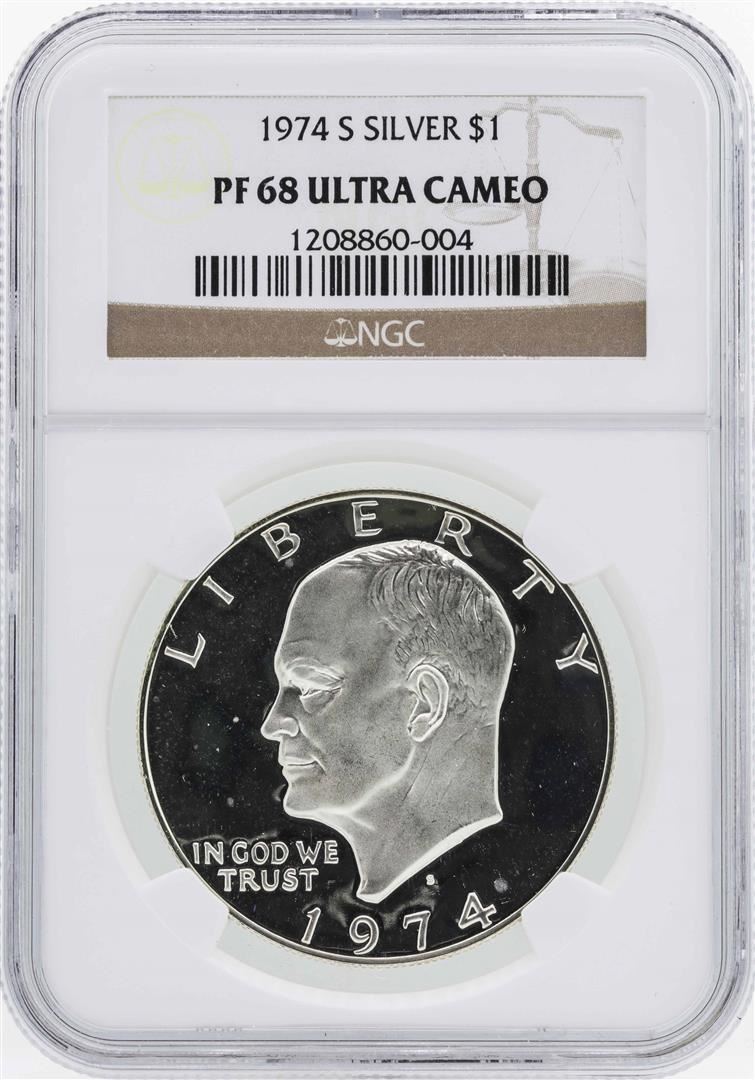 One 1974-S $1 Eisenhower Proof Clad Dollar Coin NGC PF68 Ultra Cameo. NGC Certified.
