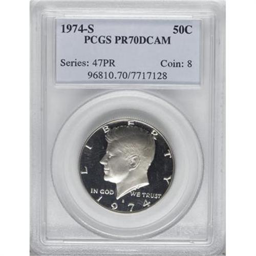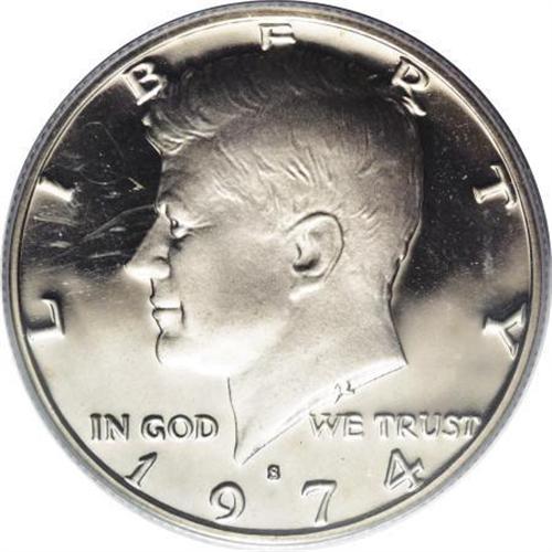 <B>1974-S 50C PR70 Deep Cameo PCGS.</B></I> Another of the clad issues from early in the Kennedy half dollar series that is all but unobtainable in the top PR70 Deep Cameo grade, the 1974-S as of (10/07) shows only 16 pieces so graded at PCGS. The arctic-frosted devices show glints of gold coloration against the pitch-black fields. Interestingly for a proof coin, the reverse die is rotated about 5 degrees counterclockwise.<BR><I>From The Kallenberg #1 PCGS Registry Set Of Proof Half Dollars.</B></I><BR><BR><b>Shipping:</b> Coins & Currency (<a target="_blank" href="http://www.heritageauctions.com/common/shipping.php">view shipping information</a>)