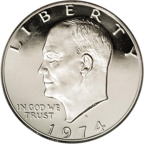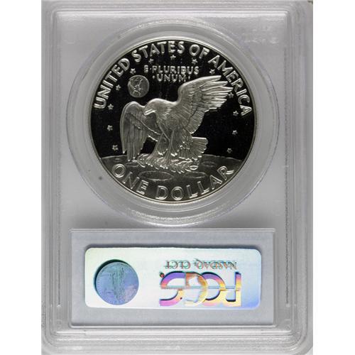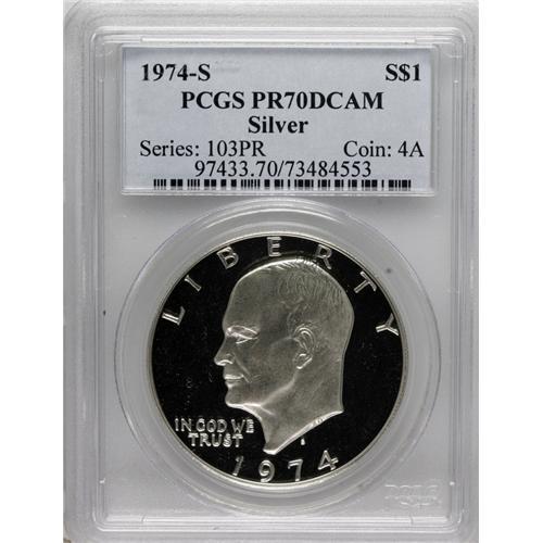 <B>1974-S S$1 Silver PR70 Deep Cameo PCGS.</B></I> A technically perfect, gleaming certified representative from the final year of the brown-box Ike dollars. Both sides display intense contrast between the fathomless silver-clad mirrors and the needle-sharp, heavily frosted devices. This piece is one of only 11 so graded by PCGS (4/07).<BR><BR><b>Shipping:</b> Coins & Currency (<a target="_blank" href="http://www.heritageauctions.com/common/shipping.php">view shipping information</a>)
