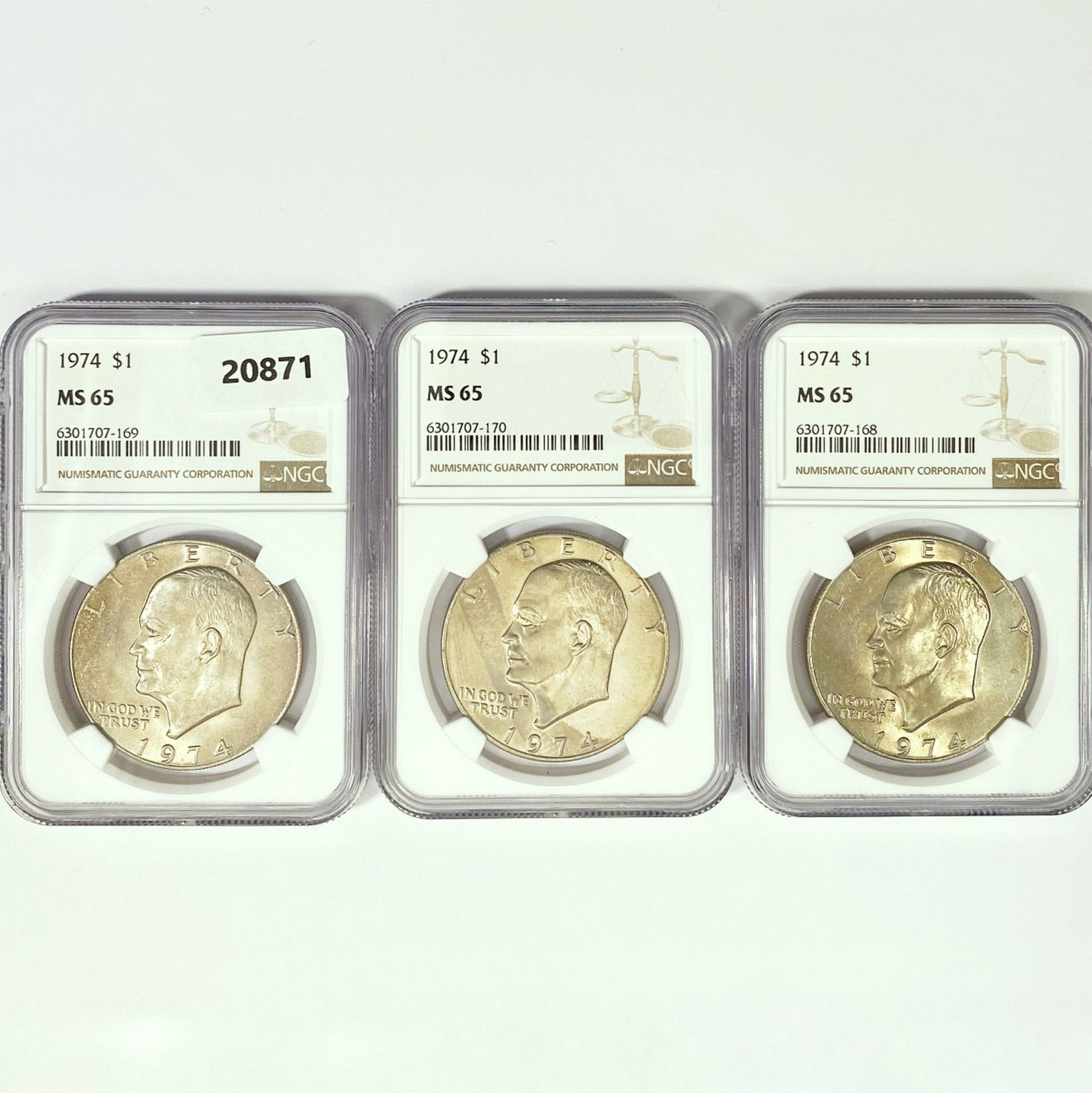 1974 Set (3) Eisenhower Silver Dollars NGC MS65