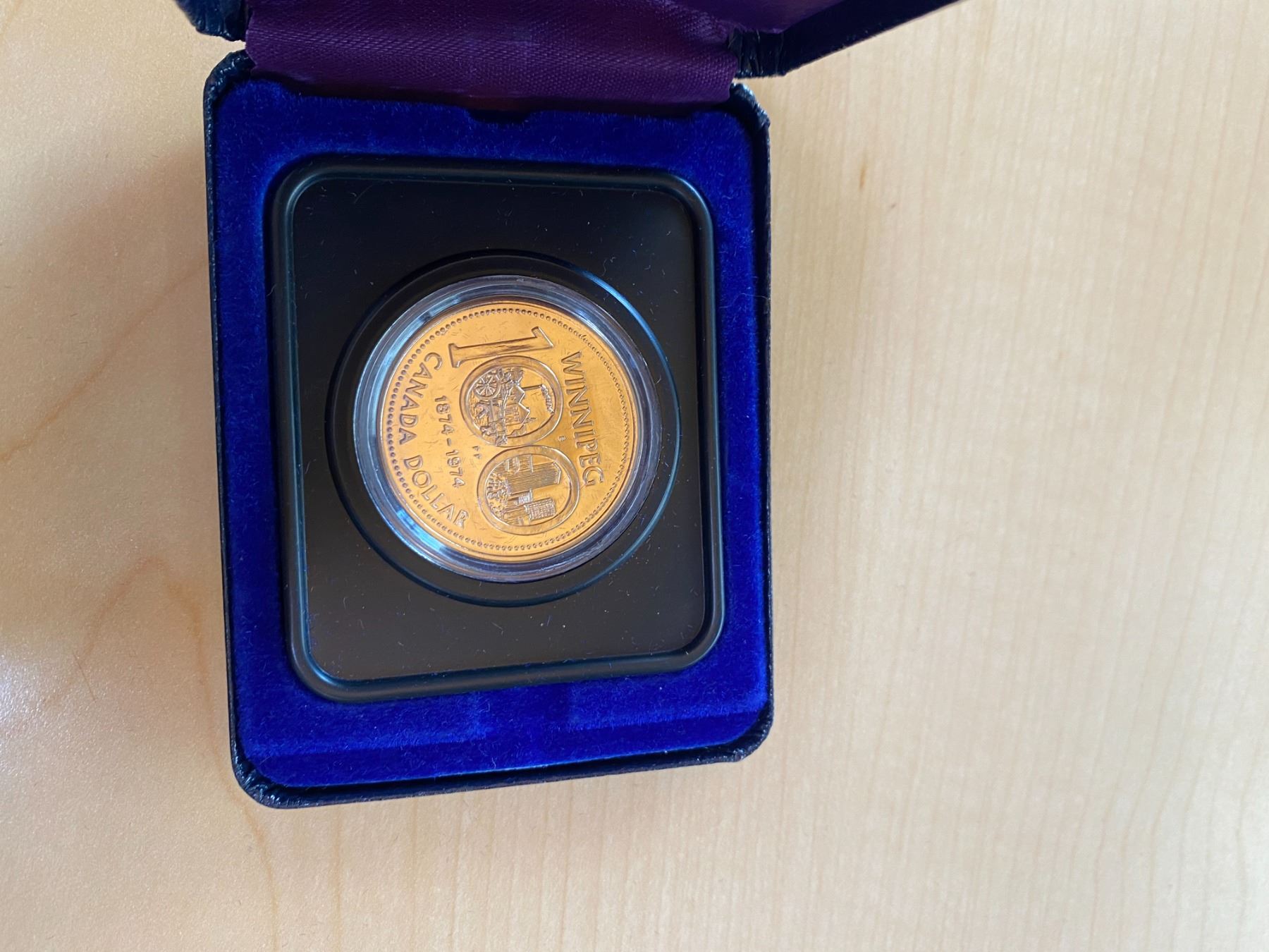 1974 Specimen Dollar that commemorates the 100th Anniversary of the City of Winnipeg. Housed in its original blue leatherette case. Specimen.