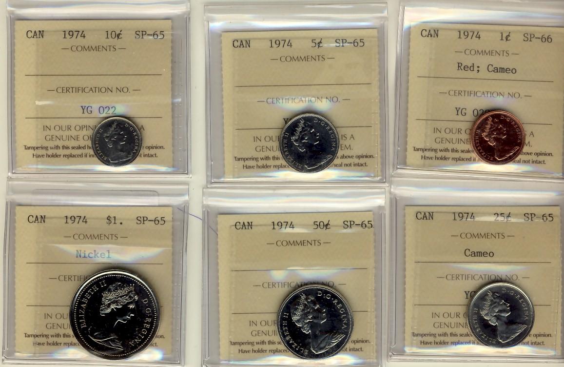 1974 Specimen Set. Complete Set graded ICCS. All coins graded SP66 except for nickel which is SP65.