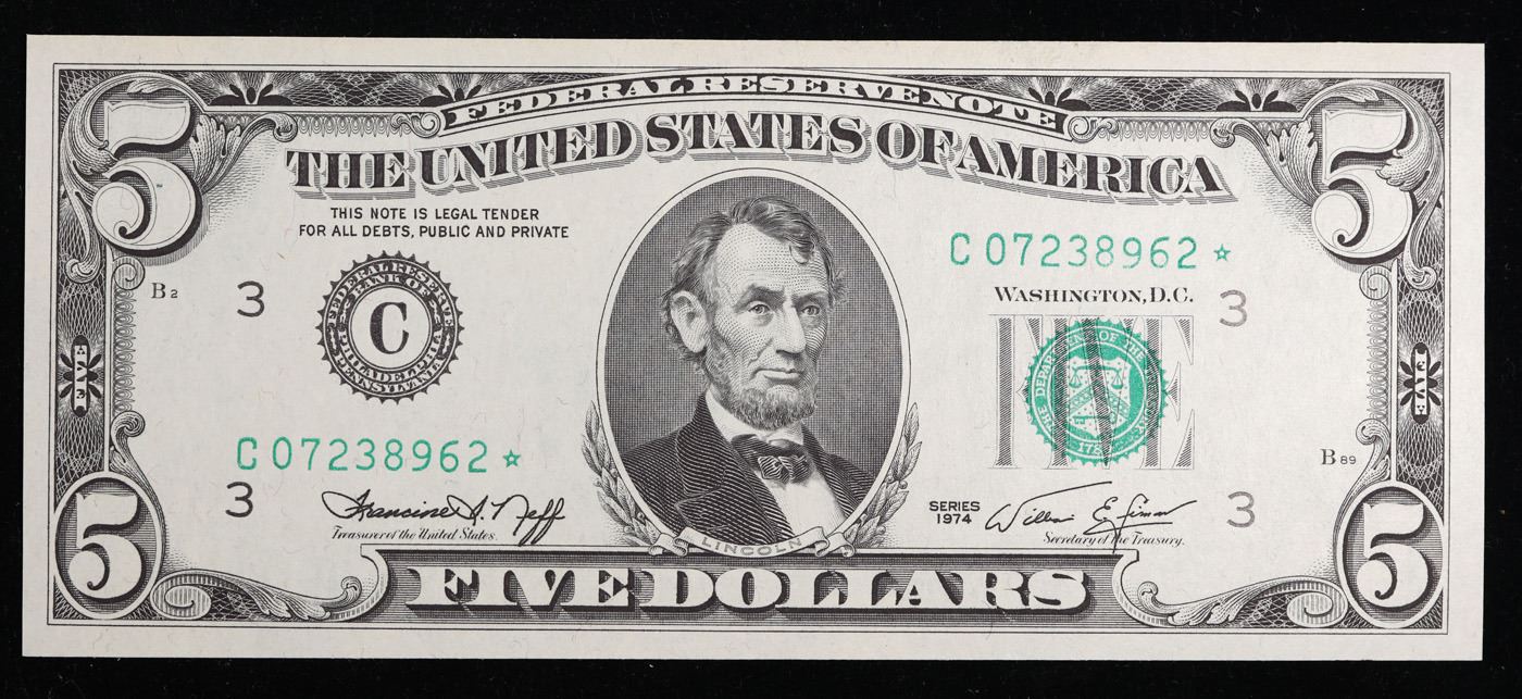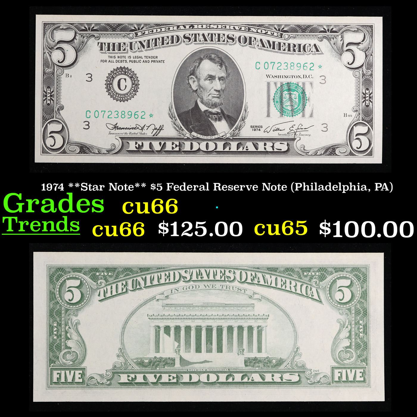 1974 **Star Note** $5 Federal Reserve Note (Philadelphia, PA) Grades Gem+ CU