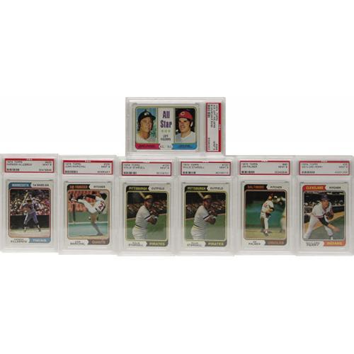 <B>1974 Topps Baseball PSA Mint 9 Lot of 135.</B></I> Massive collection of 135 Mint 9 cards from the 1974 Topps issue, all without qualifiers. Highlights from this lot are card #s 35 Gaylord Perry, 40 Jim Palmer, 100 Willie Stargell (x2), 330 Juan Marichal, 336 Pete Rose All-Star, 400 Harmon Killebrew. The remainder of the lot is comprised mostly of commons: card #s 42, 49, 54, 59, 64, 78, 81, 93, 99, 117, 122, 123, 127, 131, 138, 143, 145, 149, 150, 153, 157, 161, 163, 164, 178, 185, 195, 198, 208, 213, 216, 218, 228, 232, 239, 244, 247, 256, 260, 278, 279, 282, 287, 291, 307, 311, 314, 323, 329, 336, 339, 348, 349, 352, 354, 371, 372, 373, 374, 375, 389, 391, 393, 395, 401, 404, 412, 413, 415, 427, 437, 438, 439, 441, 455, 458, 459, 460, 466, 468, 469, 472, 477, 482, 486, 495, 498, 500, 506, 507, 511, 513, 519, 520, 524, 526, 531, 534, 549, 553, 554, 556, 561, 566, 568, 569, 574, 577, 578, 581, 584, 587, 591, 592, 594, 612, 616, 619, 622, 623, 635, 639, 640, 642, 649, 655, 656, 657. Great chance to own cards near the top of all examples that have been submitted to PSA for grading. <BR><BR><B>Important notice:</B> Heritage usually auctions material at the rate of 200-250 lots per hour. On some occasions eBay Live bid software or the Internet may not be able to keep up with the pace of the auction. We recommend placing a realistic absentee bid now as insurance to avoid disappointment. Occasionally the auctioneer may eliminate or reject an eBay Live bid, and the auctioneer may also reopen a lot after the close of the eBay live bidding (usually because we missed an audience bid), and may reject your bid even if it shows you as the winning bidder. By bidding via eBay Live, you agree that Heritage may award the lot to another bidder at its sole discretion under the circumstances described above or any other reasonable circumstances. Since eBay bids are not shown to us until we open the lot on the floor, we treat those bids just like floor bids. In most cases the floor responds before the eBay bid is presented to us, due to Internet lag time, so for consistency we have made it a policy that floor bids are always considered first over tie eBay live bids. Also please note that all Heritage lots purchased through eBay Live carry a 22.5% Buyer's Premium. Please make sure you read the Terms and Conditions before you bid. This lot is being auctioned in conjunction with a live floor auction by Heritage Galleries & Auctioneers. All final auction and invoice information will be supplied by Heritage Galleries & Auctioneers, and all other information should be considered preliminary. Lot:19629 <BR><BR><B>Winning Notification and Billing:</B> After the FINAL session in this auction is complete, Heritage will send e-mail and snail mail invoices. This process normally takes several days. All final auction and invoice information will be supplied by Heritage Galleries & Auctioneers, and all other information should be considered preliminary. <BR><BR>This auction will be conducted on a live auction floor and over the Internet through eBay Live. If you choose to place an absentee bid, please take a moment to <font color='#0000ff'><u><a href='http://pages.ebay.com/liveauctions/help/before/laabsentee.html'>learn how eBay Live absentee bidding works</a></u></font><font color='#000000'>