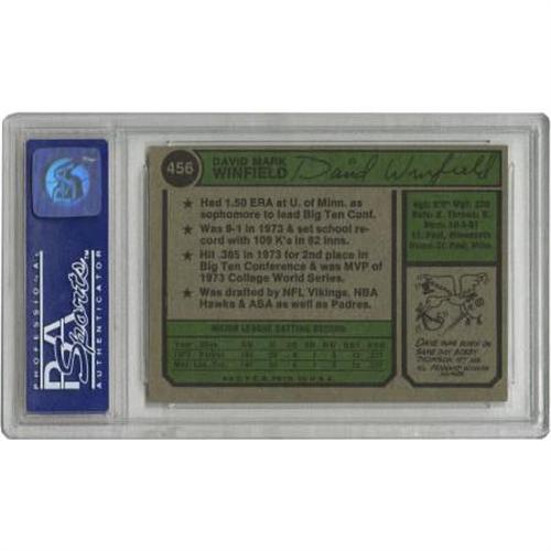 <B>1974 Topps Dave Winfield #456 PSA NM-MT 8.</B></I> The unbelievable athlete Dave Winfield has been faithfully rendered in this pack-fresh card from the '74 Topps issue, shown here in his Padres uniform. Winfield chose baseball after being drafted in three different sports upon graduation from the U of Minnesota. This rookie card of the Hall of Famer rates a strong PSA 8.<BR><BR><b>Shipping:</b> Requires 3rd Party Shipping (<a target="_blank" href="http://www.heritageauctions.com/common/shipping.php">view shipping information</a>)