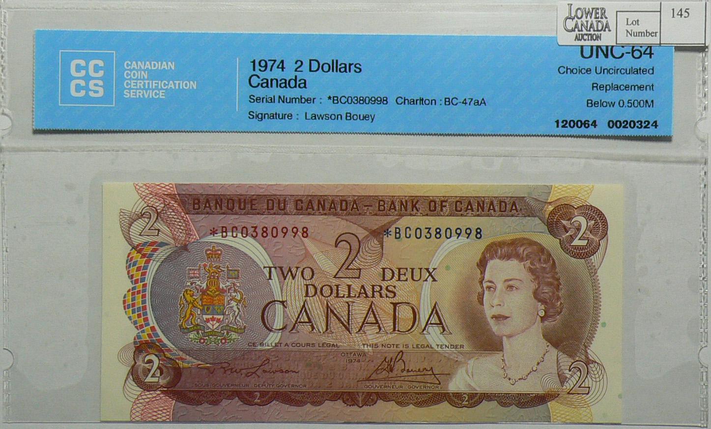 1974 Two Dollars Replacement, BC-47aA, CCCS UNC-64, Lawson Bouey, serial *BC0380998.