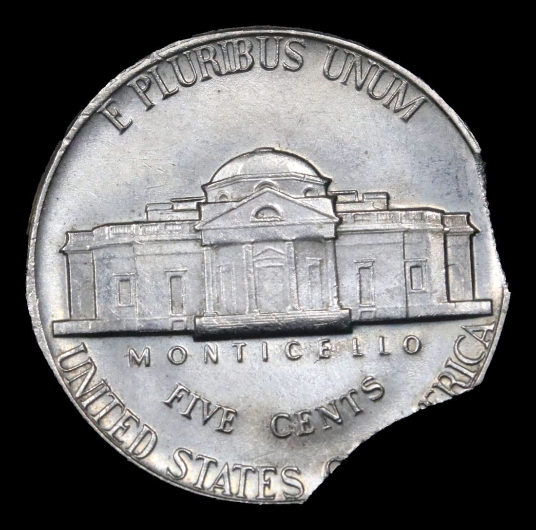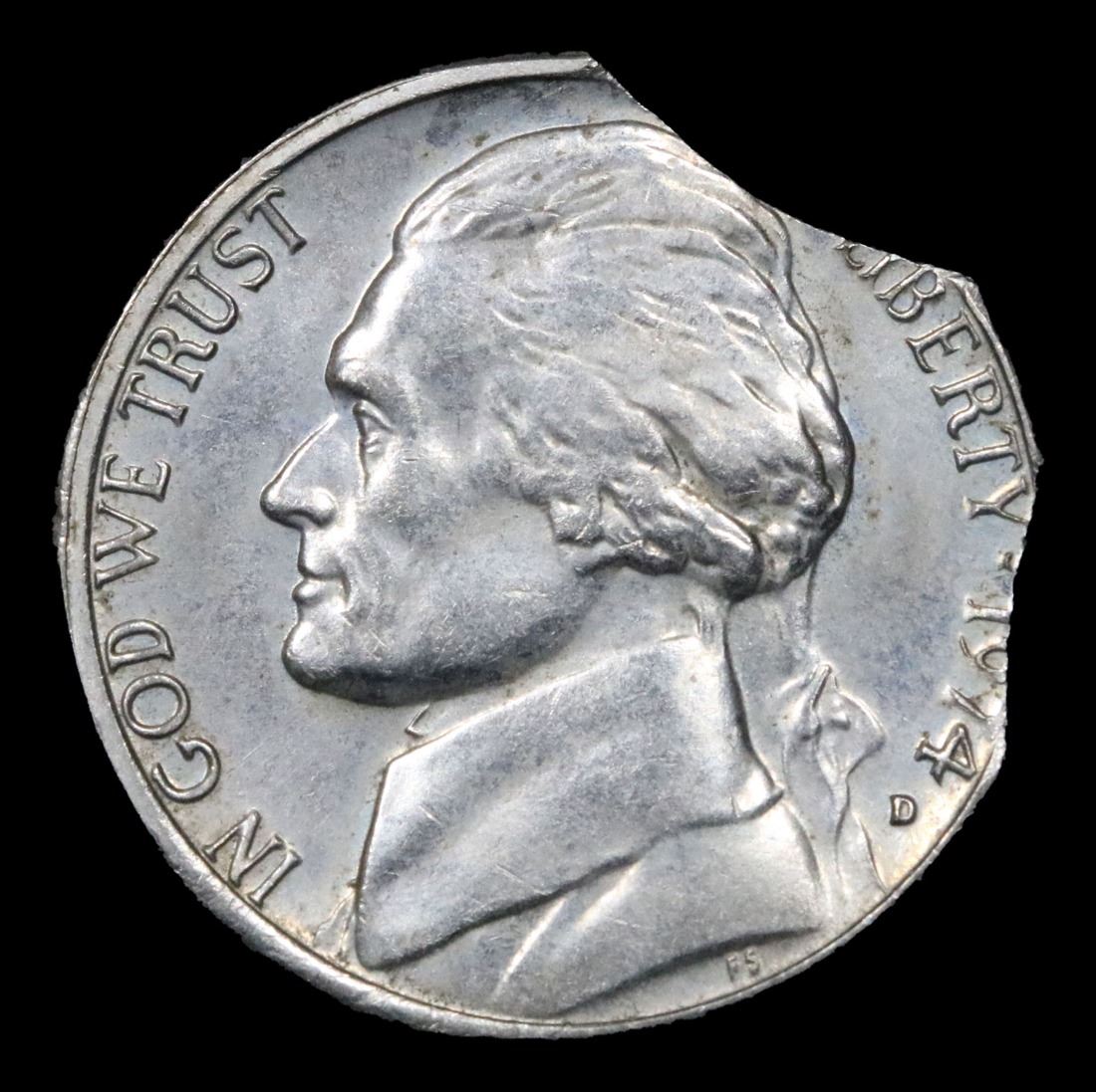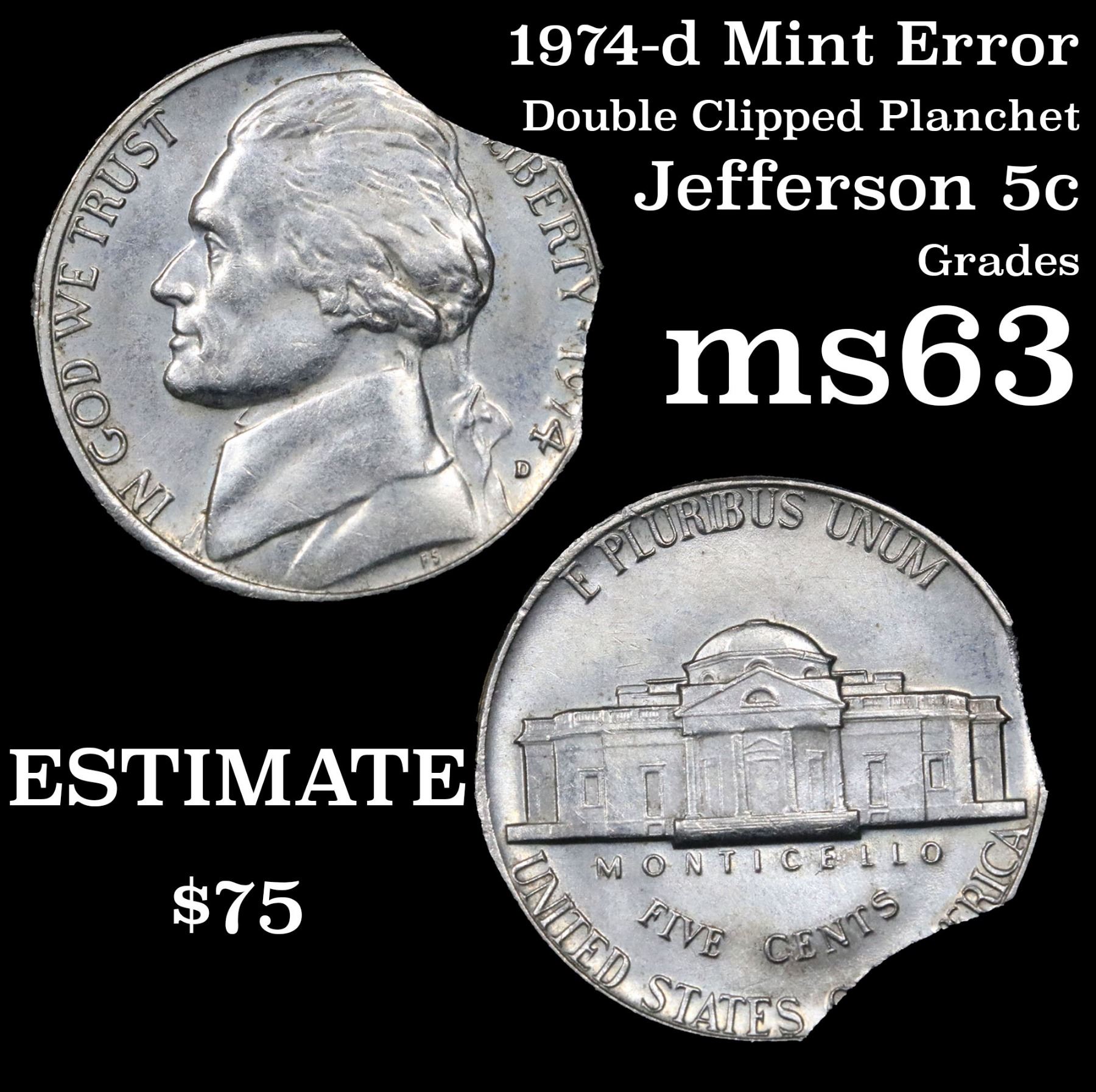 1974-d Mint Error 'Double Clipped Planchet' Jefferson Nickel 5c Grades Select Unc.